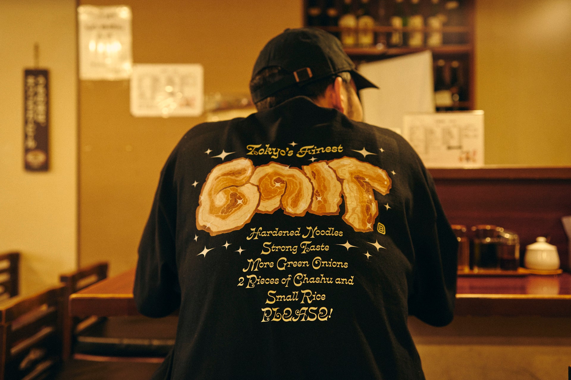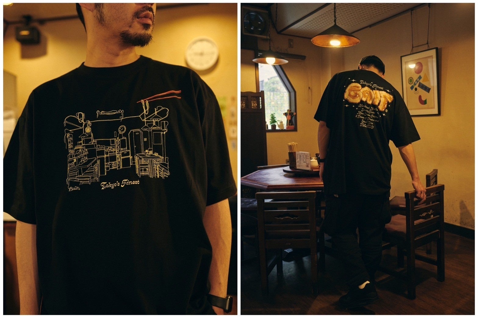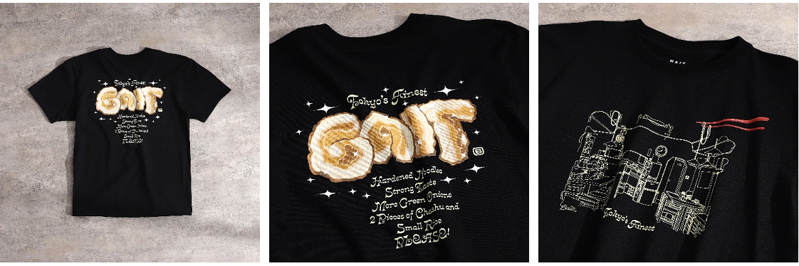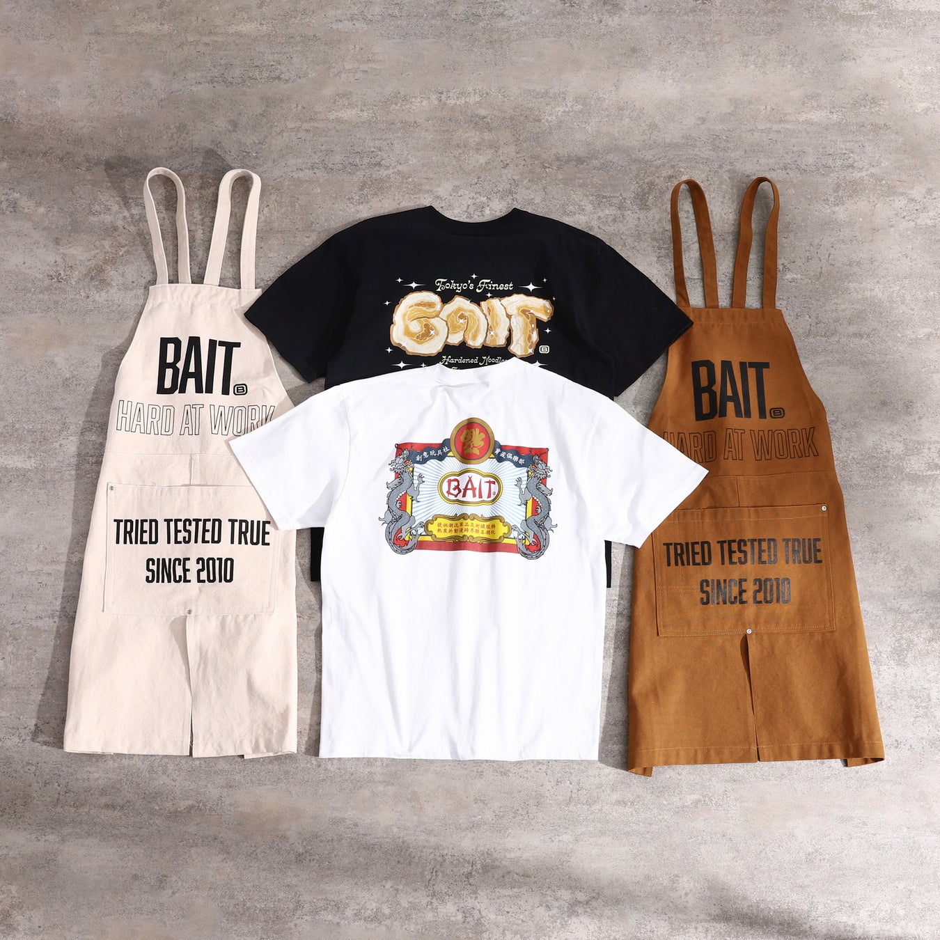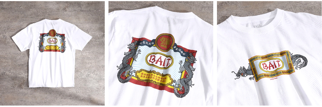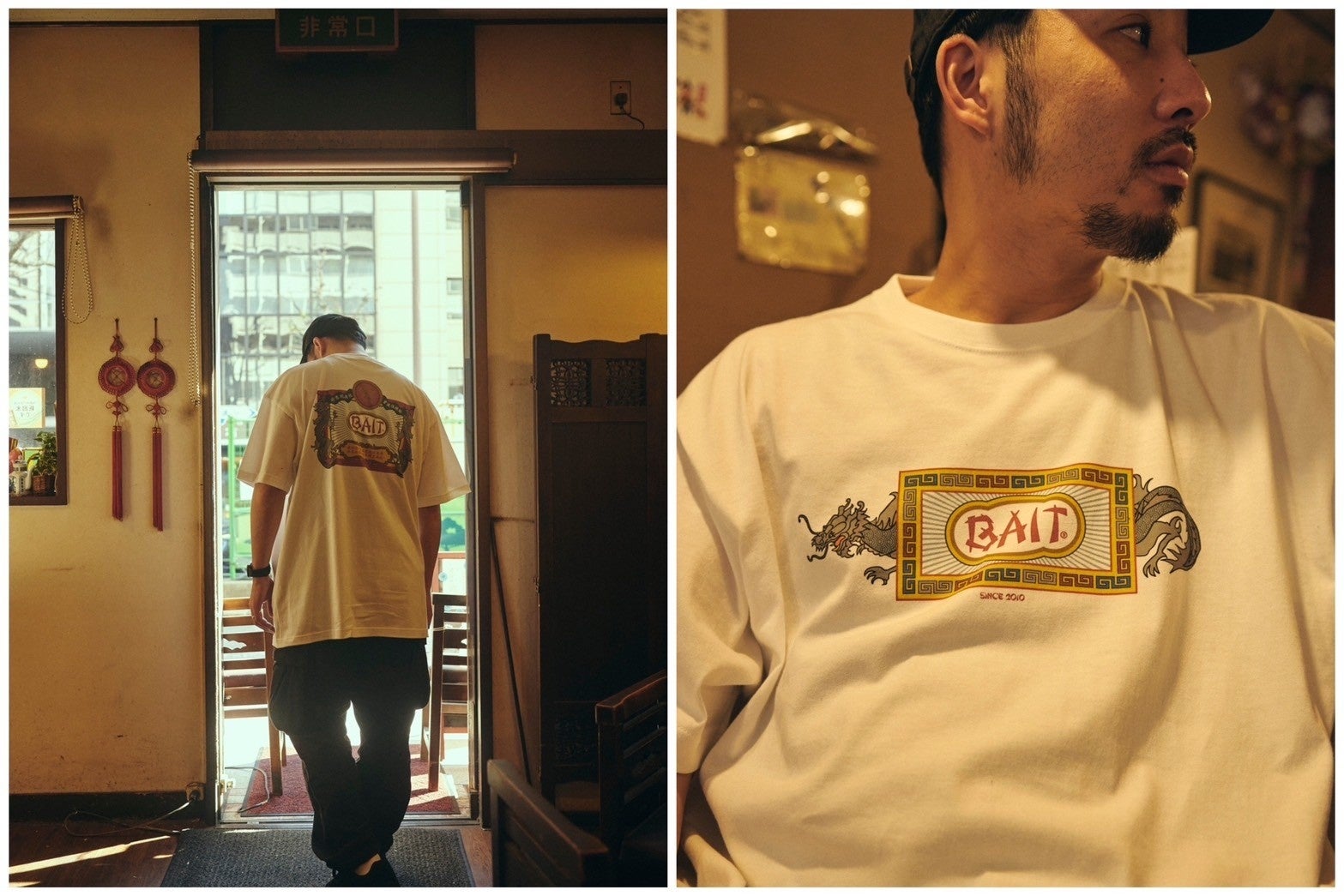 Tシャツは幸運を招く象徴などとして古くから崇められた高貴な紋章である龍をあしらったラーメンどんぶりの模様を落とし込んだ一着と、フロントにはラーメン屋の店内を麺で表現し、バックにはチャーシューであしらわれたBAITの文字が印象的な一着がラインナップします。