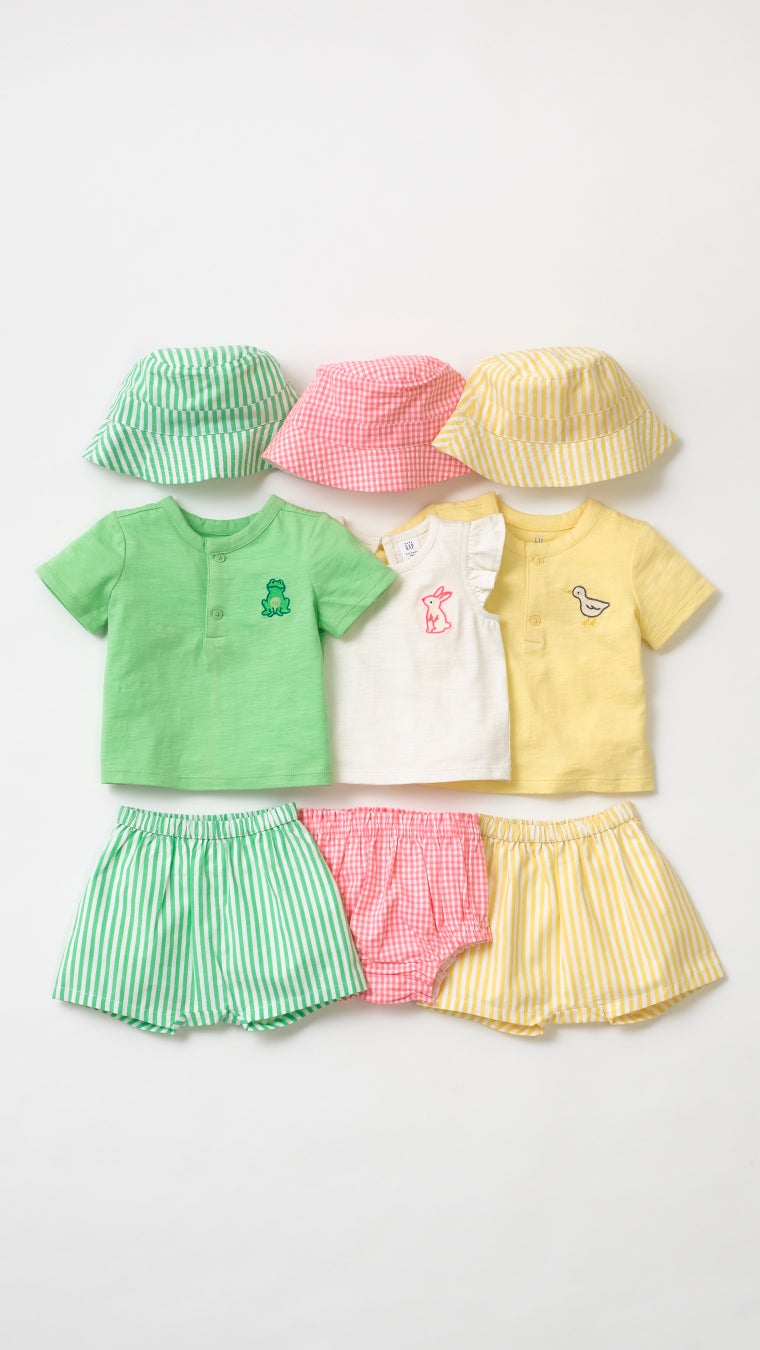 ベビーは、トドラーからフルーツ柄や花柄、カラーブロックが可愛いウィンドブレーカー、肌着としても使えるTシャツとパンツのセットアップ、消防車や恐竜のプリントが施されたスウェットなど、ベビー達の好きが詰まった通園やおでかけにぴったりのアイテムが登場。ニューボーンは、Gapのアイコンキャラクター「ブラナンベア」がお尻にプリントされたロンパースにニュートラルカラーのドットやストライプ、ブラナンベアの総柄などの新色が登場。また、ギフトにも最適なTシャツ、ショートパンツ、帽子の3点セットも揃います。