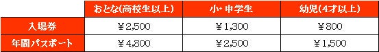 【料 金】おとな(高校生) ¥3,500/小・中学生 ¥2,300/幼児(4才以上) ¥1,800