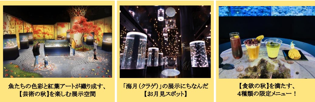 クリエイティブカンパニー『NAKED, INC.(ネイキッド)』が手掛ける美しい紅葉のデジタルアートと生きものが融合し、から紅に染まる海の世界。秋を象徴する“紅葉”の他にも、小水槽ゾーン「秋華画廊」では、魚たちの色彩と旬の花々が織り成す【芸術の秋】を表現。神秘的なクラゲの展示ゾーンは満月の装飾を施し、【お月見スポット】を創出します。「ドルフィンパフォーマンス」も昼夜で異なるプログラムを展開。デイver.は【実りの秋】を祝う収穫祭をテーマにイルカたちが躍動し、ゲスト参加型の演出もふんだんに取り入れました。もちろん【食欲の秋】を満たすイベント限定メニューも紅葉舞うカフェバーにてご用意しております。