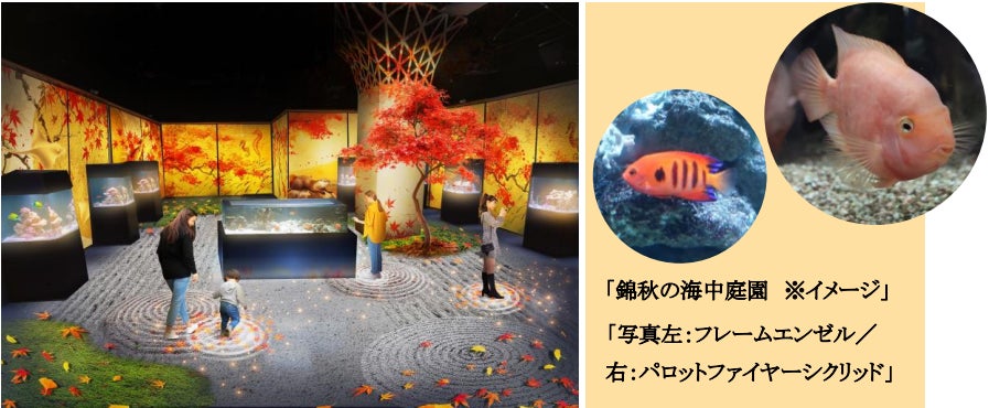フロアに並ぶ12本の水槽で舞泳ぐのは木の葉のような姿の「リーフフィッシュ」をはじめ、秋色をまとった魚たち。その中でも、同イベントよりお披露目となる幅約2m×奥行約2mの“シンボリック水槽”では薄紅色の淡水魚「パロットファイヤーシクリッド」を展示します。生きものの彩りと季節感あふれるデジタルアートの融合で“深まる秋”を表現します。