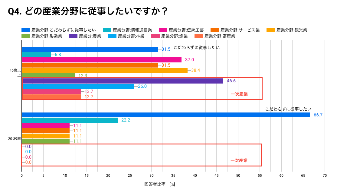 40代以上では、一次産業である「農業」(回答者全体の46.6%)に続いて「観光業」(回答者全体の38.4%)「伝統工芸」(回答者全体の37.0%)など、特定の産業に興味関心が集まりました。一方、20・30代では「こだわらずに従事したい」が66.7%と突出して多い結果となりました。