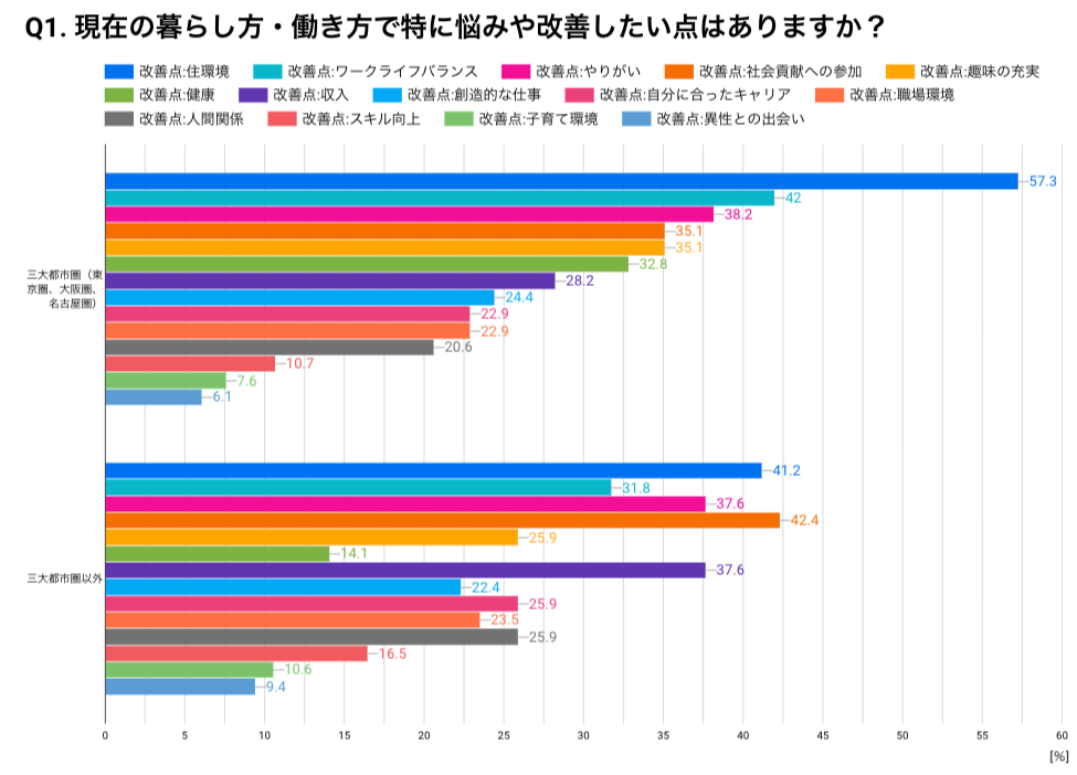 地域興味層(SMOUT登録者)に、現在の暮らし方・働き方で特に悩みや改善したい点(複数回答)を尋ねたところ、三大都市圏(東京圏、大阪圏、名古屋圏)に居住している人では、1位が「住環境」(回答者全体の57.3%)、2位が「ワークライフバランス」(回答者全体の42.0%)、3位が「やりがい」(回答者全体の38.2%)でした。このように三大都市圏では「住環境」が改善したい点として57.3%と突出して多かった一方、それ以外の地域では1位が「社会貢献への参加」が1位(42.4%)という結果となりました。