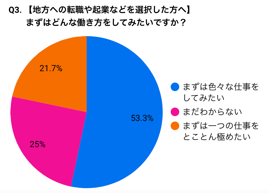 【3】「地方への転職や起業」を選んだ人のうち53.3%が「色々な仕事をしてみたい」を選び、「1つの仕事をとことん極めたい」の21.7%を大きく上回った。