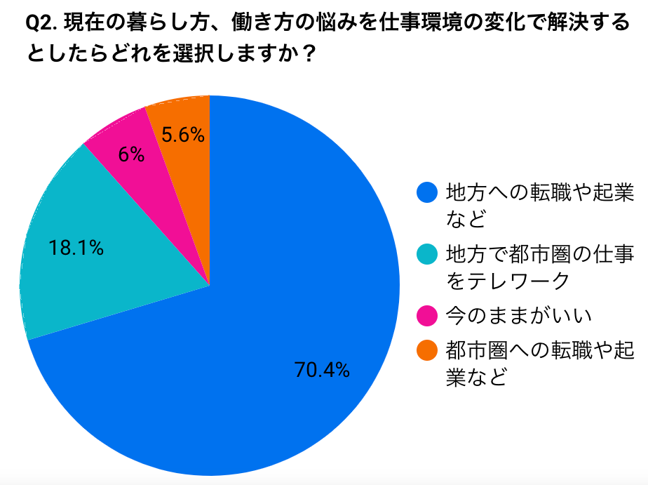 仕事環境の変化で今感じている課題を解決するとしたらどの方法を選ぶか「都市圏への転職や起業など」「地方で都市圏の仕事をテレワーク」「地方への転職や起業など」「今のままがいい」の4つの選択肢から回答を得たところ、3つめの「地方への転職や起業など」を希望している人が全体の70.4%を占めました。ここから、地方を拠点にしたライフスタイルにシフトしたいと考える傾向が高いことが伺えます。