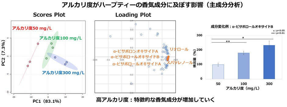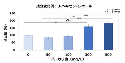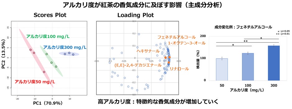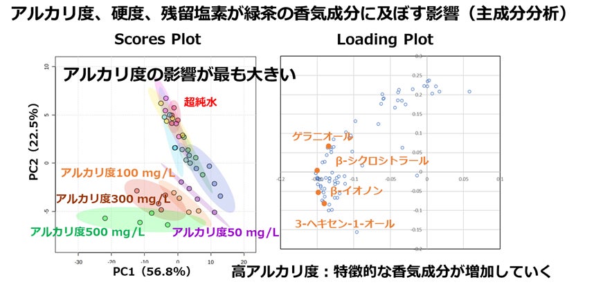 アルカリ度、硬度、pH、残留塩素を調整した水を用意し、それぞれの水(80℃)で緑茶を淹れ、香りに関わる香気成分と、味に関わる呈味成分を網羅的に分析しました。その結果、緑茶の香気成分に関してはアルカリ度の影響が最も大きく、アルカリ度が高くなるとモノテルペンや青葉アルコールが増加し、緑茶特有の香りが強くなる傾向が確認されました。