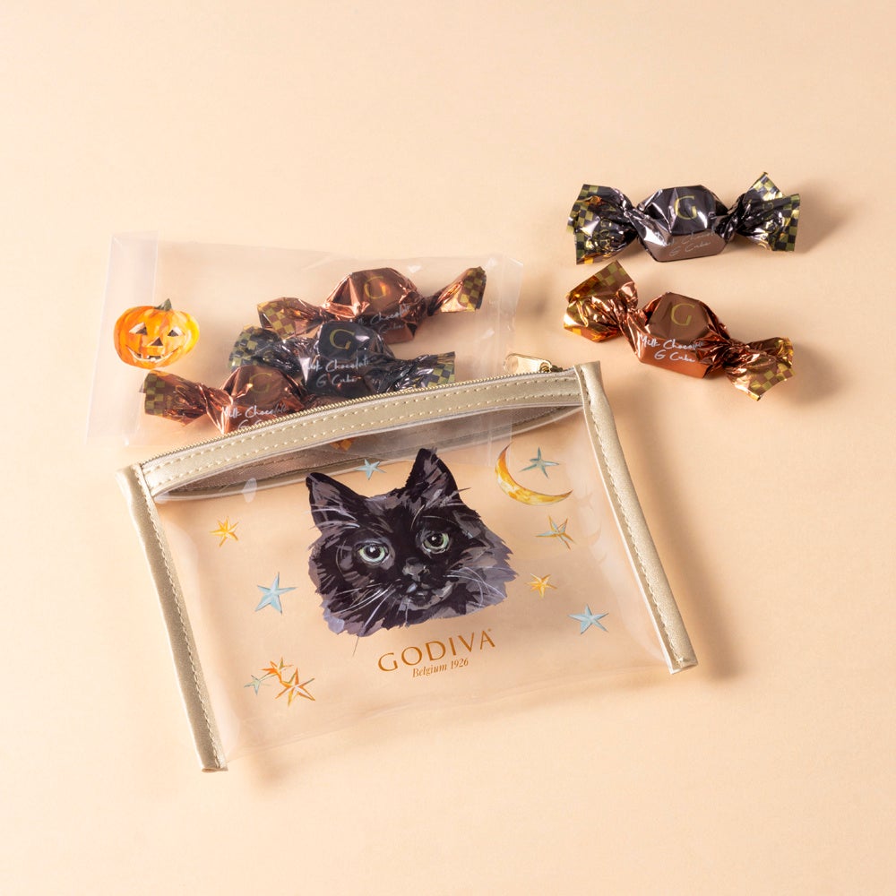 2024年のゴディバのハロウィンのパートナー、黒ネコを描いたクリアポーチに、ミルクとダークのG キューブ チョコレートを詰め合わせました。バッグに入れて連れ歩きたいキュートなポーチと、ゴディバのチョコレートのおいしさをシンプルに味わっていただけるG キューブ チョコレートとのセットは、ご自分用にはもちろん、ネコ好きな方へのプレゼントにもぴったりです!