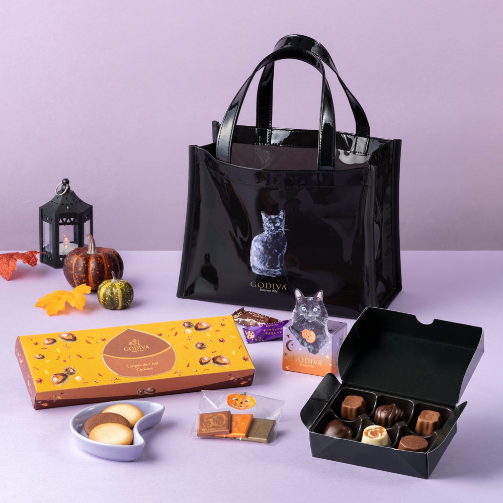 ハロウィンシーズンのお持たせやギフトにもぴったりなお買い得セット。6粒入のアソートメントをはじめ、カレ、モンブランラングドシャクッキーなど、ゴディバの定番の味わい、季節のフレーバーを幅広くお楽しみいただけます。ゴディバ ブラックキャット コレクションの黒ネコがプリントされたバッグは、秋のレジャーやお出かけにもぴったりです。