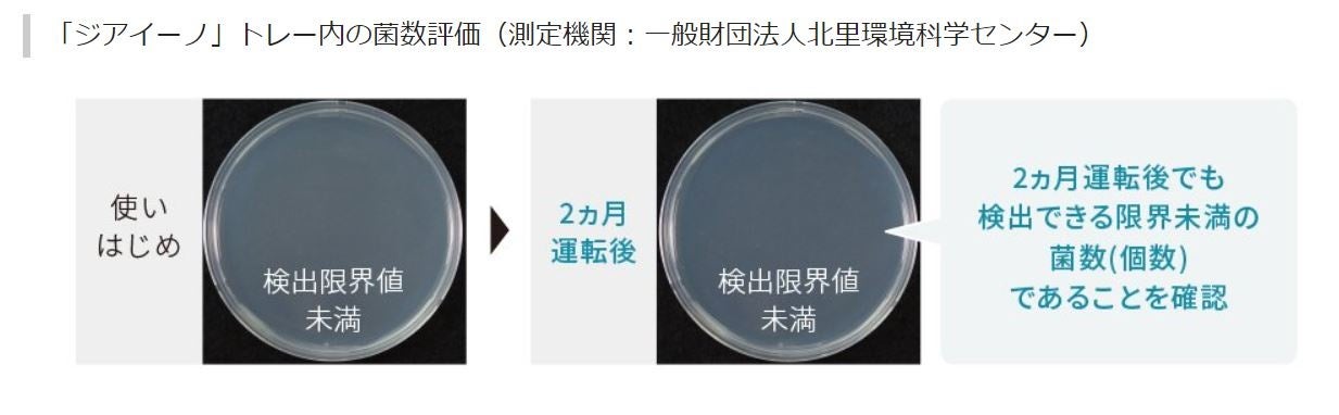 ※1:【測定機関】一般財団法人北里環境科学センター【測定方法】培養法(塗抹)にて次亜塩素酸 空間除菌脱臭機(F-MV4300)のトレー水の菌数を測定【対象】2ヵ月間運転したトレー水の菌数【測定結果】10個/1ml未満(検出限界値:10個/mL) 〈報告書番号〉北生発2022_0172号