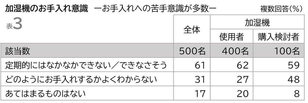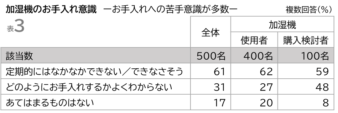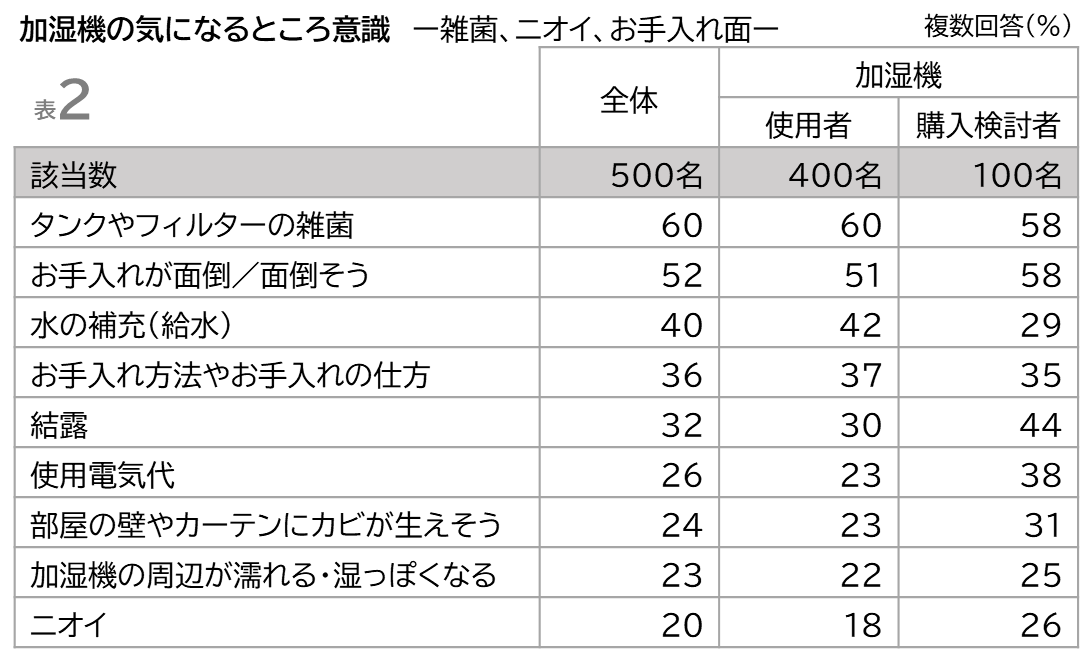 加湿機の使用において、雑菌やニオイが気になっているのと同時に、「お手入れ方法やお手入れの仕方」「お手入れが面倒/面倒そう」(表2)との回答も多数ありました。
