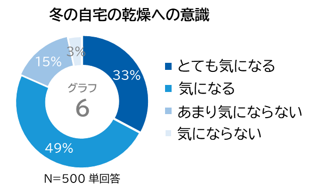 約42%が半日以上の使用であり、約24%が1日中使用しているという結果に。グラフ6にもあるように、約8割の方が冬の自宅の乾燥を気にしていると回答しており、冬場の室内の乾燥対策として、加湿機を長時間運転で使用していることがわかります。