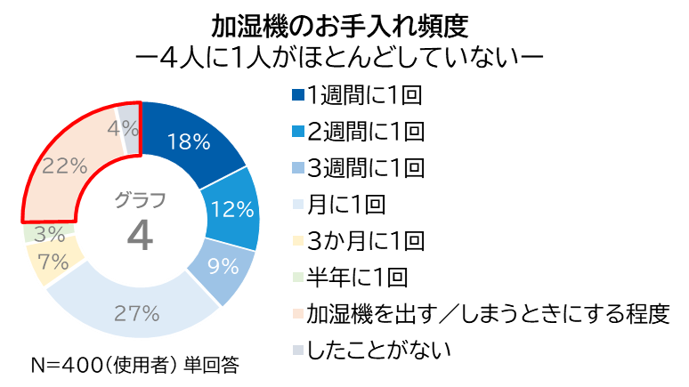 冬場使用中のお手入れ頻度の質問に対して、月1回以上お手入れしている人が約65%。一方で、約22%は加湿機を出す/しまうときにする程度、約4%はお手入れをしたことがないと回答しています。