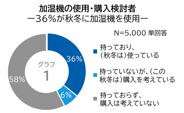 まず、30~69歳女性の5,000名を対象にスクリーニング調査を実施したところ、4割超の方が加湿機を使用中、もしくは、この秋冬での購入を検討中と回答しました。