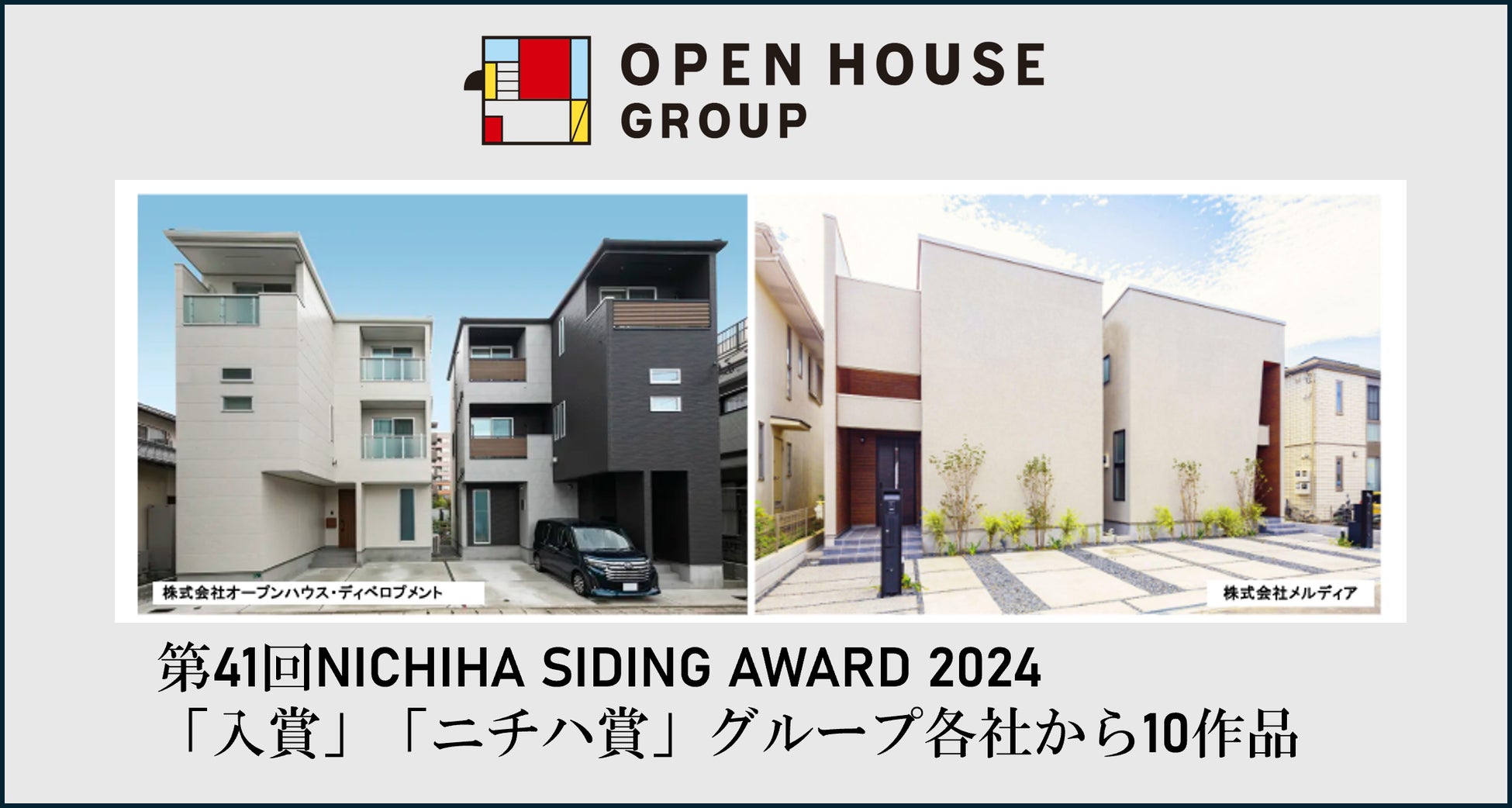 株式会社オープンハウスグループ(本社 東京都千代田区、代表取締役社長 荒井正昭、以下「当社」)より、ニチハ株式会社が主催する第41回「NICHIHA SIDING AWARD 2024」において、応募総数1,162件の中から、当社グループの株式会社オープンハウス・ディベロップメント(本社 東京都千代田区、代表取締役社長 福岡良介、以下「オープンハウス・ディベロップメント」)が「入賞」1作品、「ニチハ賞」2作品の計3作品、株式会社メルディア(本社:東京都新宿区、代表取締役社長:菊池 健太、以下「メルディア」)が「入賞」1作品、「ニチハ賞」6作品の計7作品をそれぞれ受賞いたしましたのでお知らせいたします。