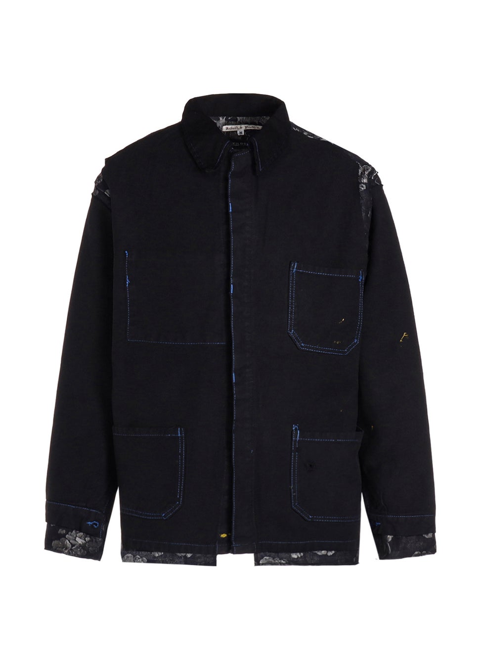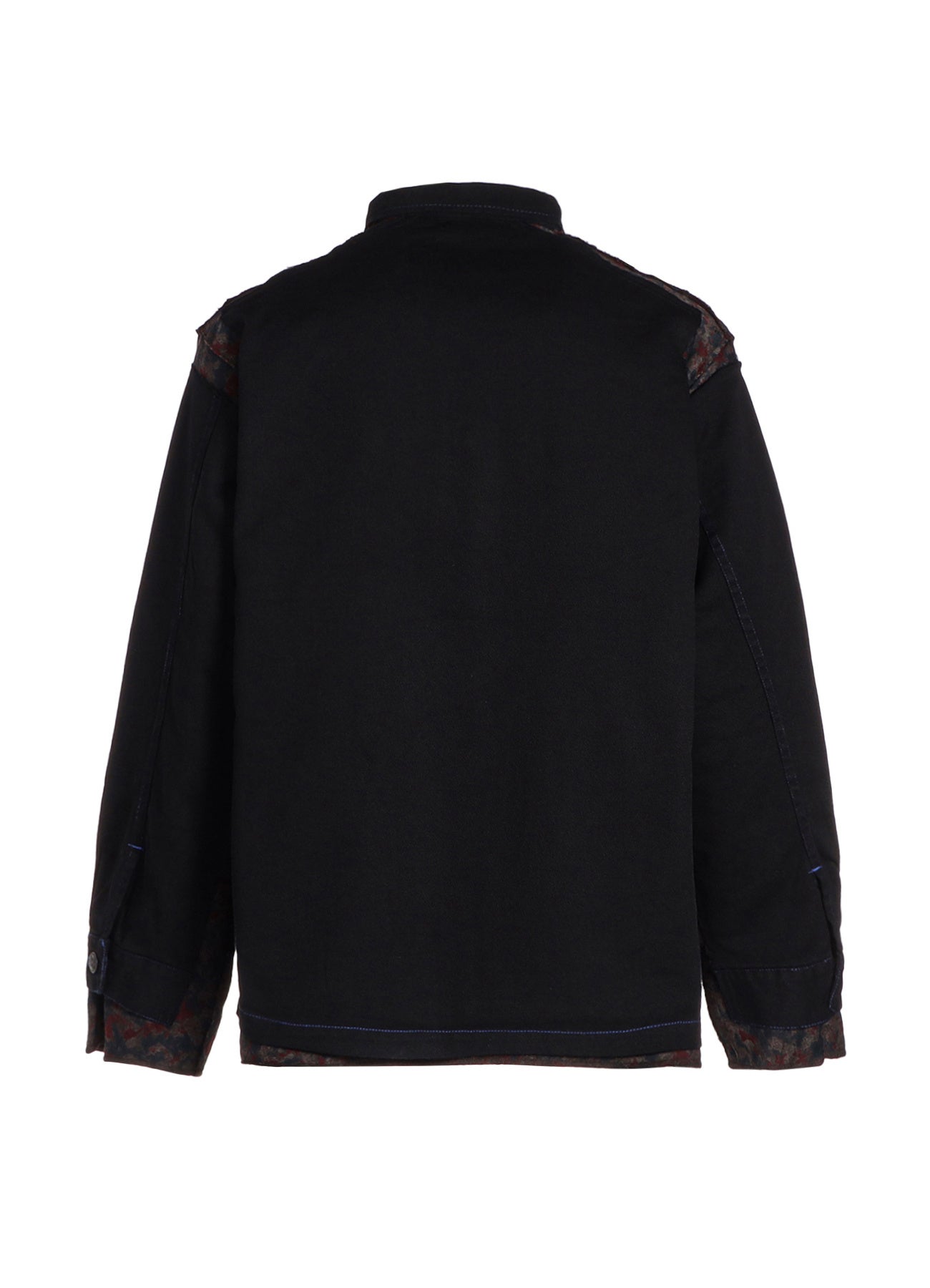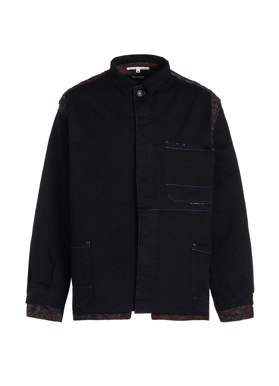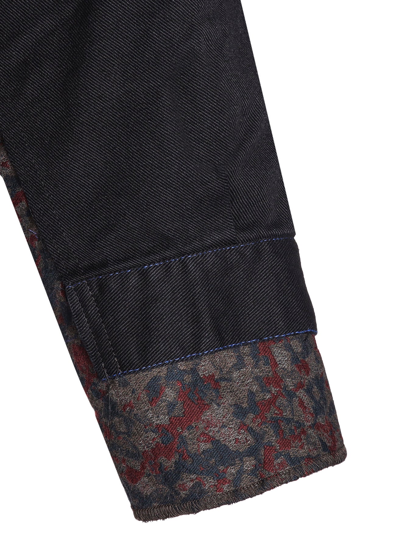 230年ほどの歴史を持つ「播州織」のジャガード生地は、複雑で奥行きのある色の表現と、なめらかな質感、そして、柄の立体感が特徴的です。その2種類の生地に墨をかけ、ムラ染めしたかのような独特な風合いを加えた手の込んだ生地となっています。また、縫い合わせたユーロワーク部分は、フレンチワークで代表的なインクブルーと呼ばれる色の、モールスキンやコットンツイルのカバーオールやパンツを解体し、コラボレーション特別仕様として全てブラックに染めたものを使用しています。
