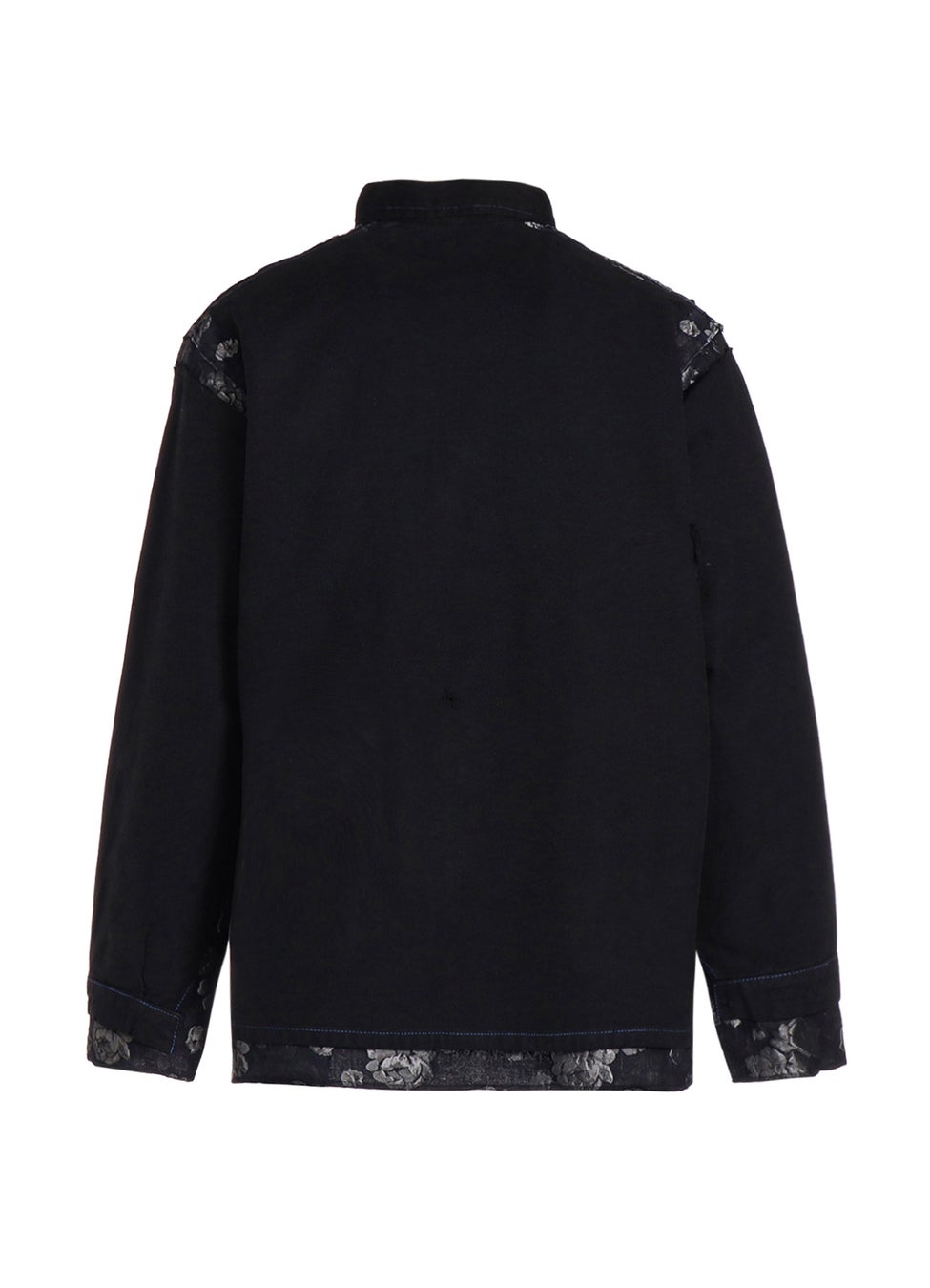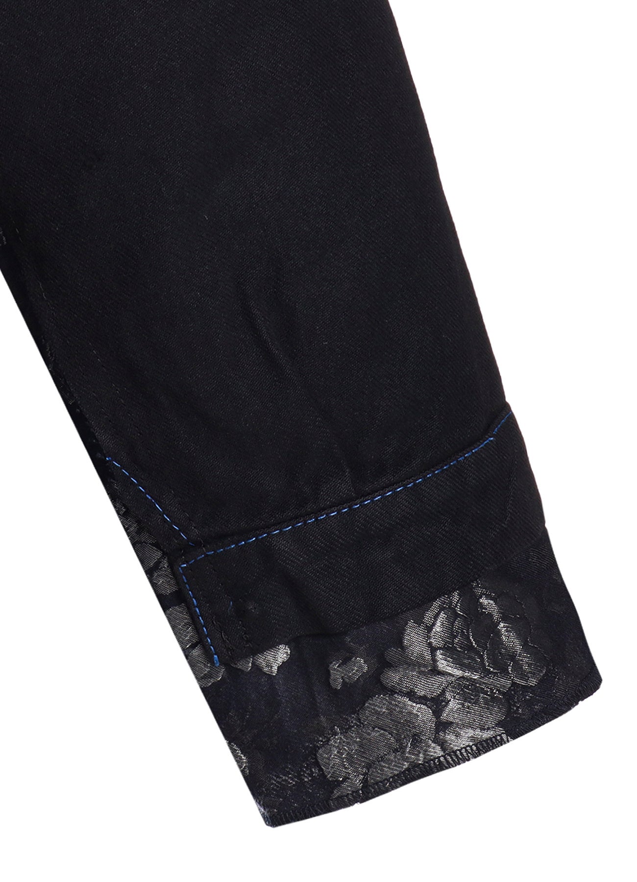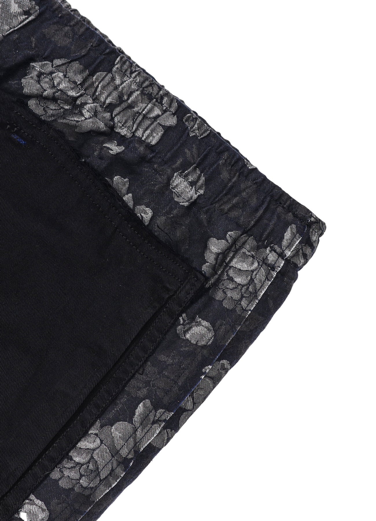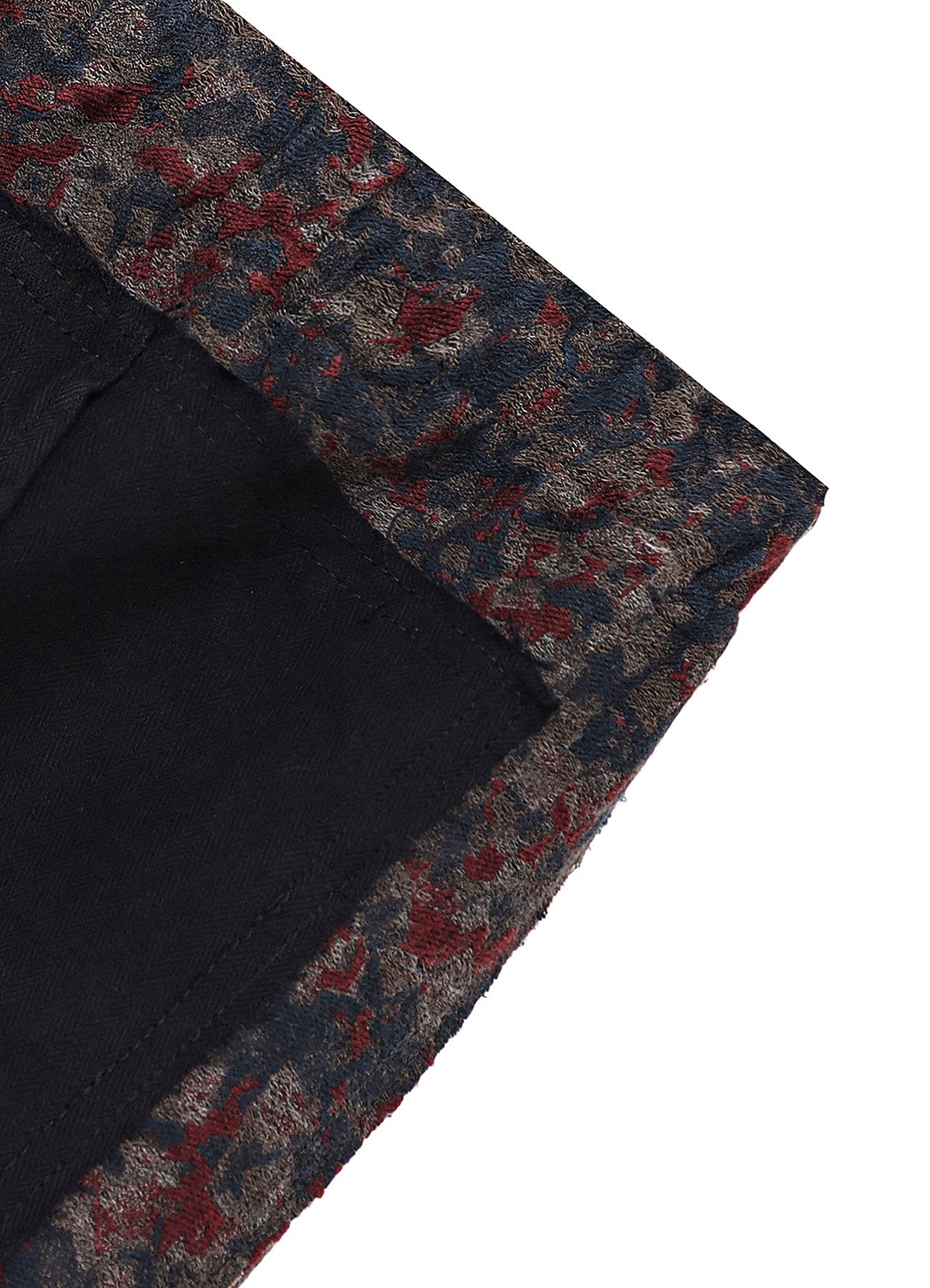 230年ほどの歴史を持つ「播州織」のジャガード生地は、複雑で奥行きのある色の表現と、なめらかな質感、そして、柄の立体感が特徴的です。その2種類の生地に墨をかけ、ムラ染めしたかのような独特な風合いを加えた手の込んだ生地となっています。また、縫い合わせたユーロワーク部分は、フレンチワークで代表的なインクブルーと呼ばれる色の、モールスキンやコットンツイルのカバーオールやパンツを解体し、コラボレーション特別仕様として全てブラックに染めたものを使用しています。