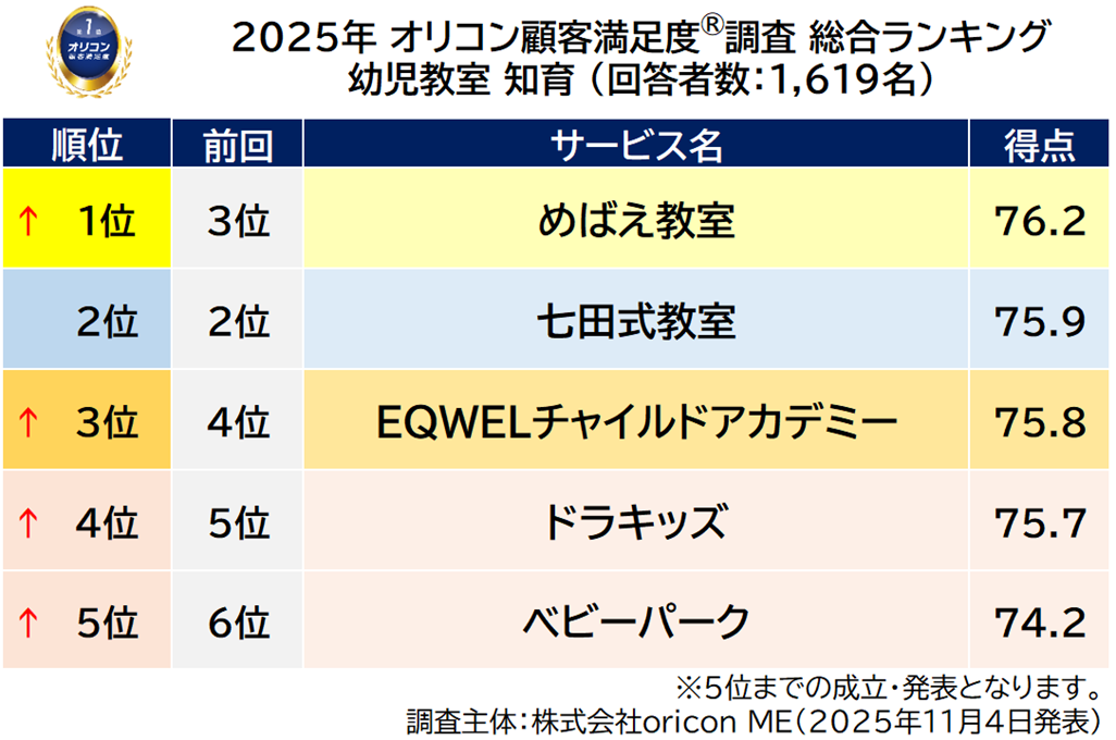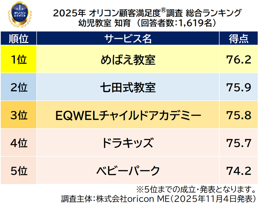 満足度の高い『幼児教室 知育』ランキング【めばえ教室】が初の総合1位「教室環境」で2年連続の1位に(オリコン顧客満足度®調査)