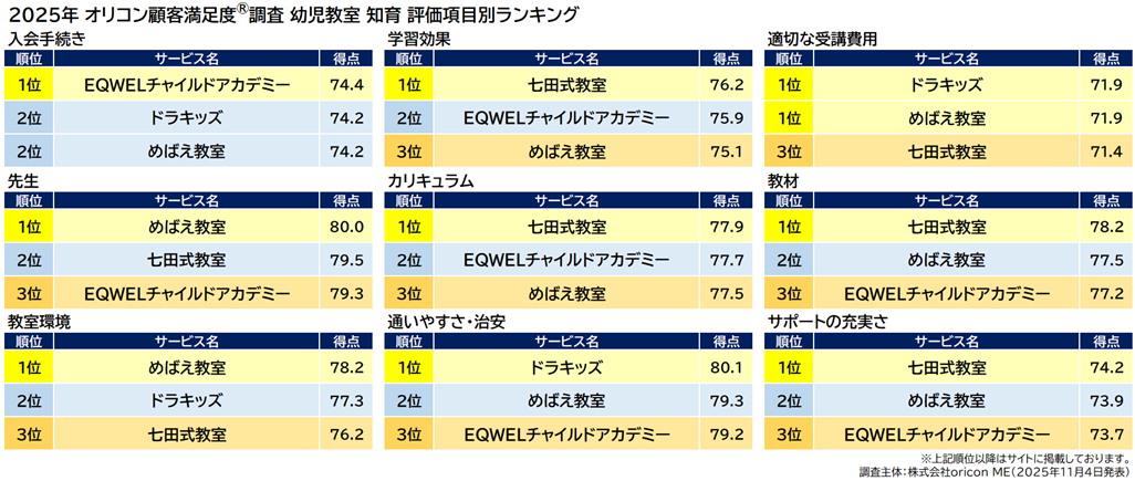 今回の調査では、【めばえ教室】が前回総合3位から順位を上げ、初の総合1位を獲得しました。