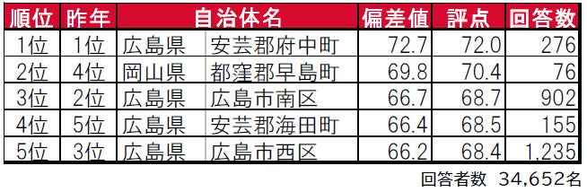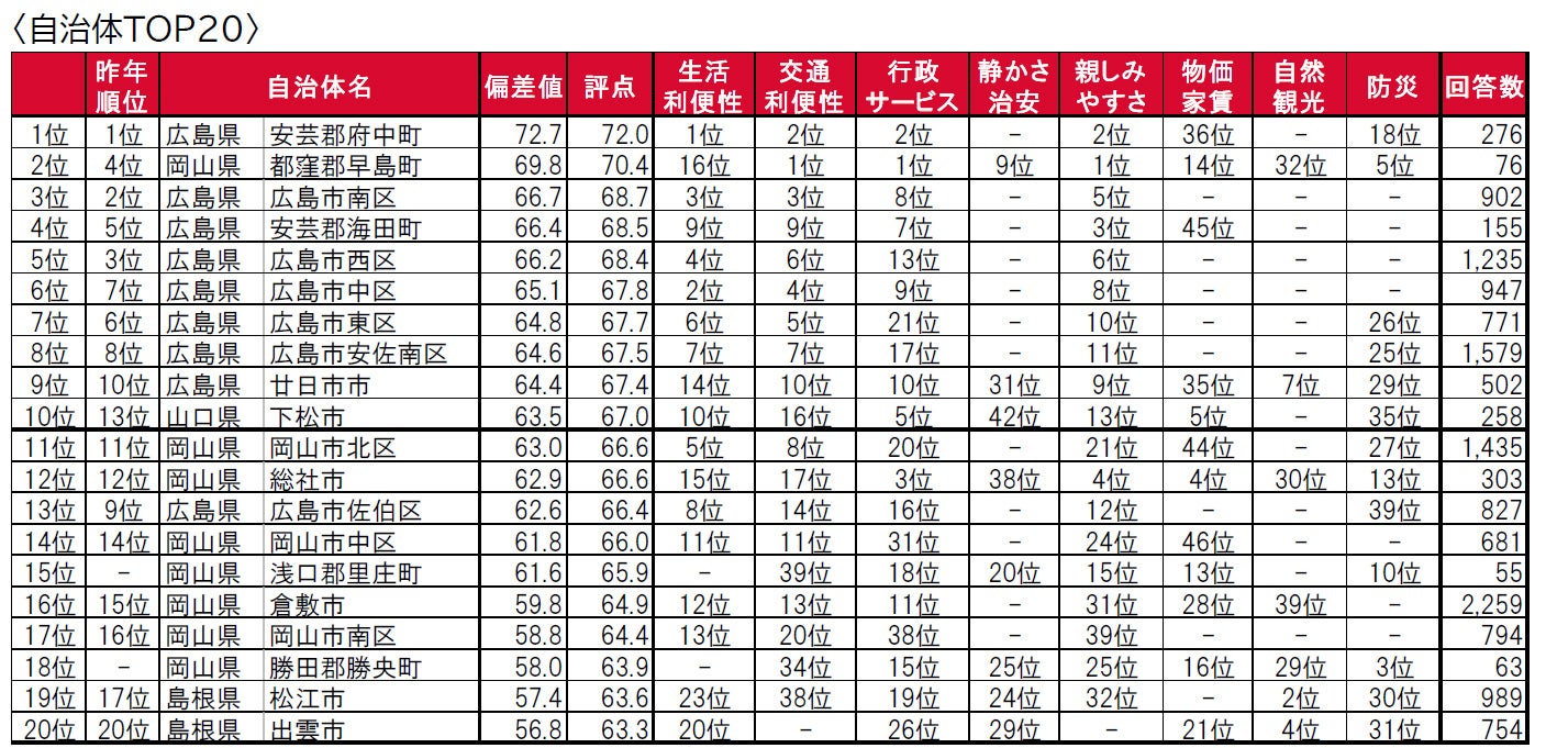トップ10内のうち8自治体は広島県の市町で、そのうち5つは広島市の区です。トップ10内の顔ぶれにさほど変動はありませんが、10位には、瀬戸内海に面する臨海工業都市で、近隣の周南市や光市を含む周南地区における商圏の中心地である山口県下松市が、昨年13位から順位を上げてランクインしています。