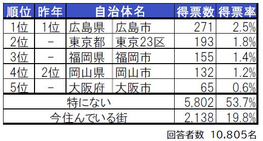 今年は集計対象を中国エリアの自治体から全国の自治体に変更しましたが、結果は変わらず3年連続で広島県広島市が1位です。2位は東京23区、3位は福岡県福岡市が新たにランクインしています。昨年2位の岡山県岡山市は4位です。