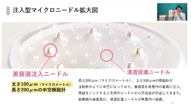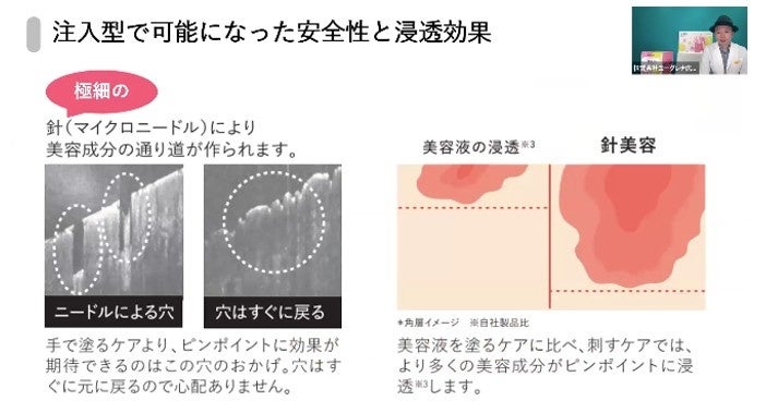 当社の注入型のマイクロニードルは、元々は化粧品用途ではなく、痛みを感じにくい医療用の注射針として開発されていたものが元になっており、それを美容用途で活用できるような針にアジャストしています。