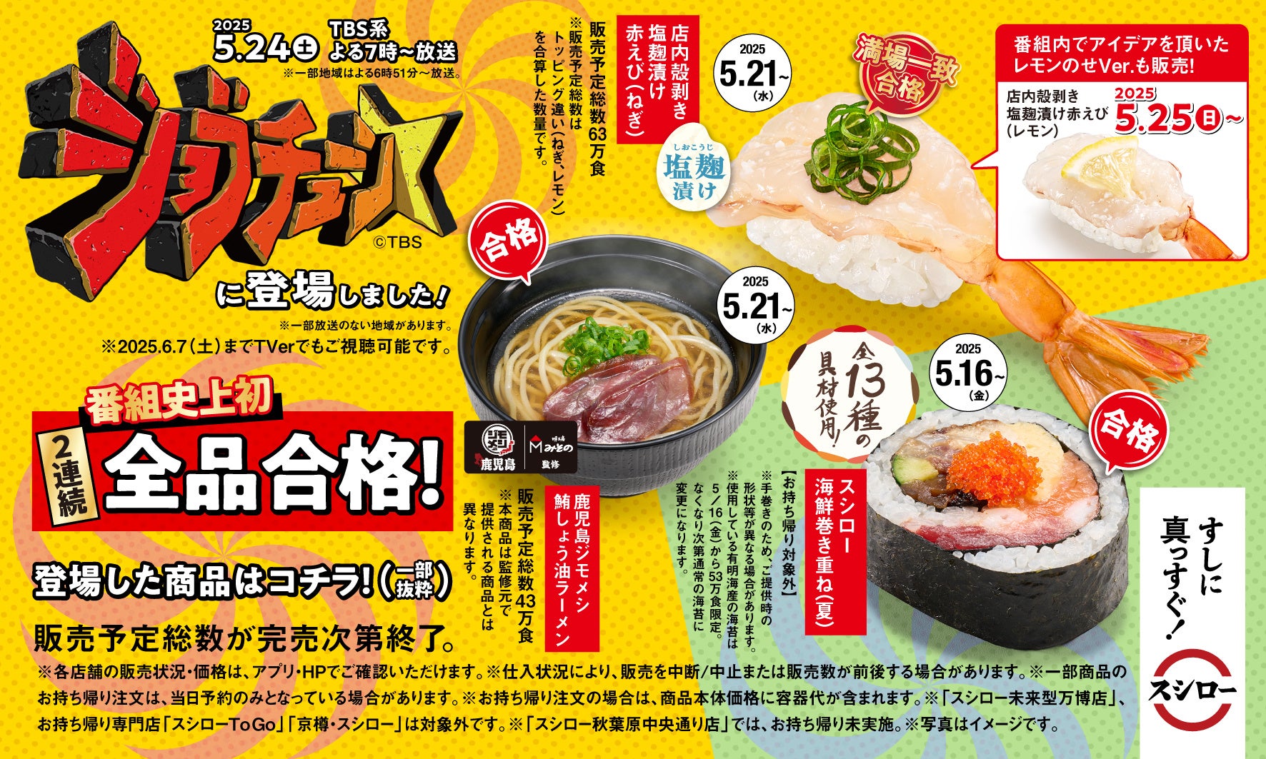 株式会社あきんどスシロー(本社:大阪府吹田市、代表取締役社長:新居 耕平)は、2025年5月24日(土)に放送されたTBS系『ジョブチューン~アノ職業のヒミツぶっちゃけます!』の人気ジャッジ企画に登場した「スシロー×超一流寿司職人」にて、番組史上初の2連続全品合格を達成しました。