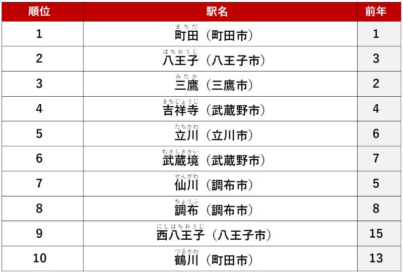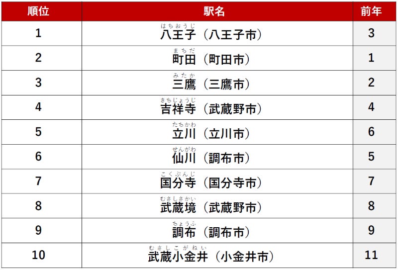 2位に「八王子」駅、3位に「三鷹」駅がランクインしました。