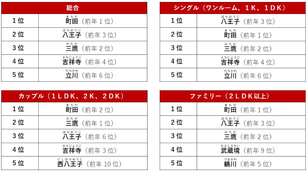 総合1位は前年に引き続き「町田」駅でした。カップル・ファミリーの2タイプで1位を獲得しています。また、総合2位の「八王子」駅は全タイプで3位以内にランクイン。「八王子」駅の家賃相場(2026年1月時点)は6.11万円とトップ5の中で最も安く、家賃の安さを意識した探し方が見受けられました。