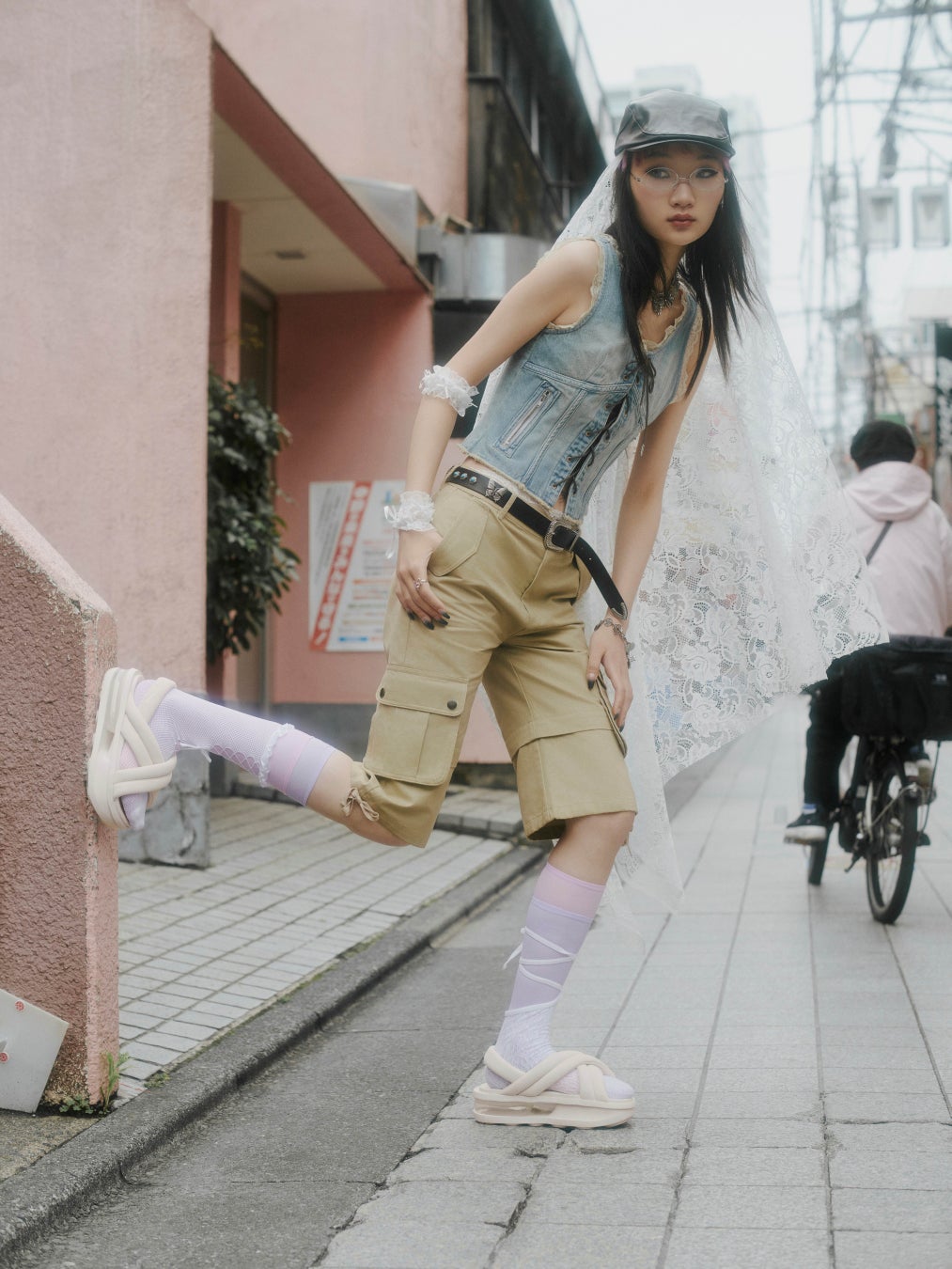 クロスデザインのアッパーと厚みのあるソールは、「足袋」や「下駄」のような和のムードを感じられ、atmos pinkが得意とするストリートスタイルはもちろんのこと、「足袋」や「下駄」からインスピレーションを受けたオリエンタルなスタイルを提案しているキービジュアルも必見です。大胆なシルエットでありながらもシンプルにまとまったモダンなデザインは、どんなスタイルにも合わせやすく、ソックスと合わせたり、素足で履いたりとコーディネートの幅が広がります。