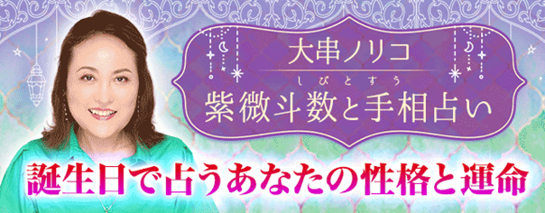 人気占いバラエティ番組出演で今大注目の鑑定士・大串ノリコが監修する、紫微斗数(しびとすう)と手相占いに特化したスマホ専用月額占いサイト『大串ノリコ 紫微斗数と手相占い』。現在『誕生日占い|生年月日で占うあなたの性格と運命【無料鑑定】』を公開中です。この機会にぜひご利用ください。