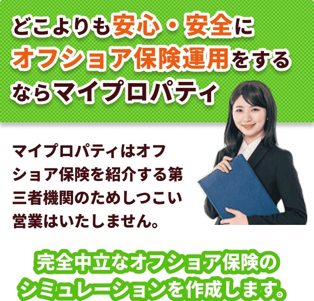 老後資金・お子様の教育資金・相続対策としてまとまったお金を用意するなら、『オフショア投資・保険のマイプロパティ』にご相談ください。