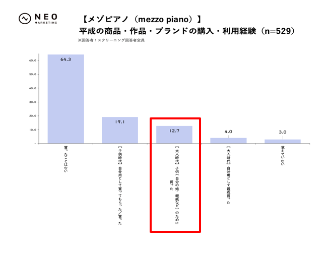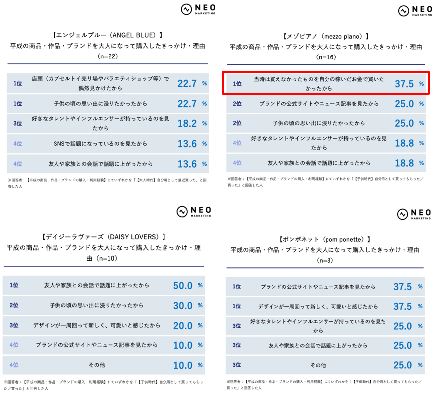 特にメゾピアノでは「当時は買えなかったものを自分の稼いだお金で買いたかった」が37.5%でトップとなっており、子供の頃の憧れを大人になった今、自分の意思で回収するような購買行動がうかがえます。