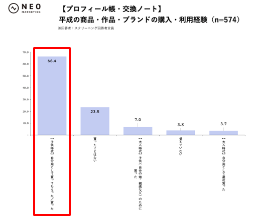 当時の購入・利用経験(【子供時代】自分用として買ってもらった/買った)が特に強かったのは、「プロフィール帳・交換ノート」66.4%と「シール交換・シール帳」49.8%。平成女児カルチャーの中でも、日常的に手元で使い、友人同士のやり取りの中に自然に入り込んでいたものほど、購入・利用経験の広がりが大きかったことがわかりました。