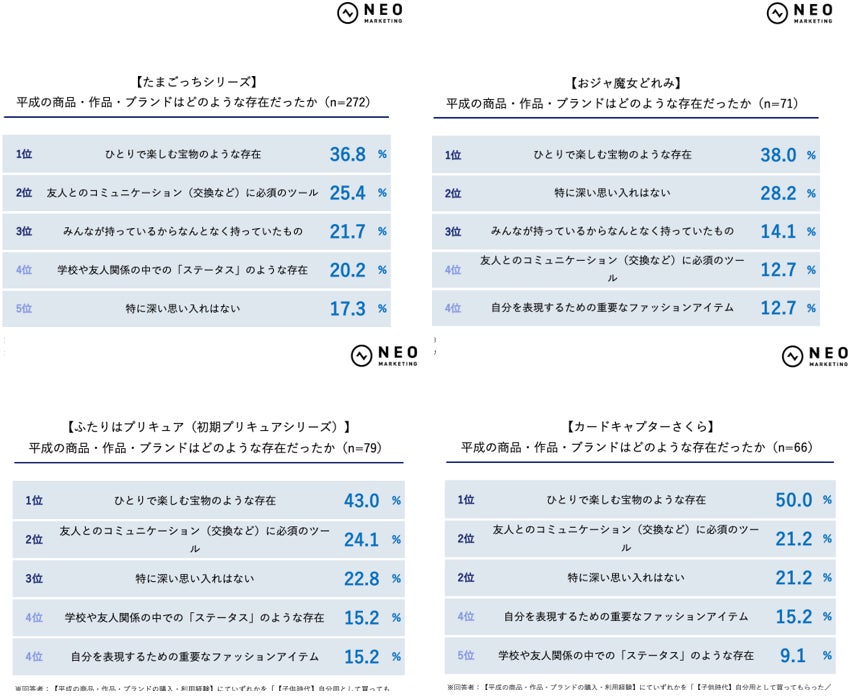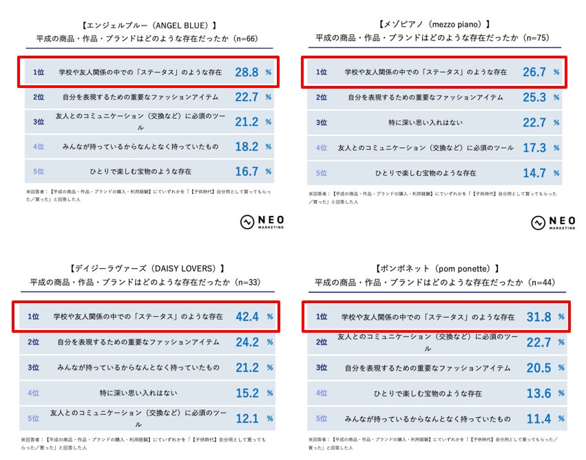 ファッションブランド群では「学校や友人関係の中での『ステータス』のような存在」が上位に入りやすく、デイジーラヴァーズ42.4%、ポンポネット31.8%、エンジェルブルー28.8%、メゾピアノ26.7%と、持っていること自体に価値を感じる側面が強かったことがわかる。平成女児カルチャーの中でも、ファッションは“好き”だけでなく“憧れ”や“背伸び”を可視化する役割を担っていたようだ。