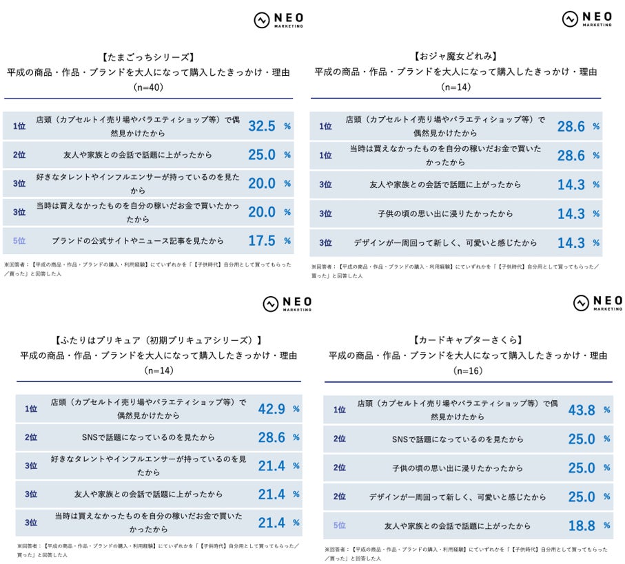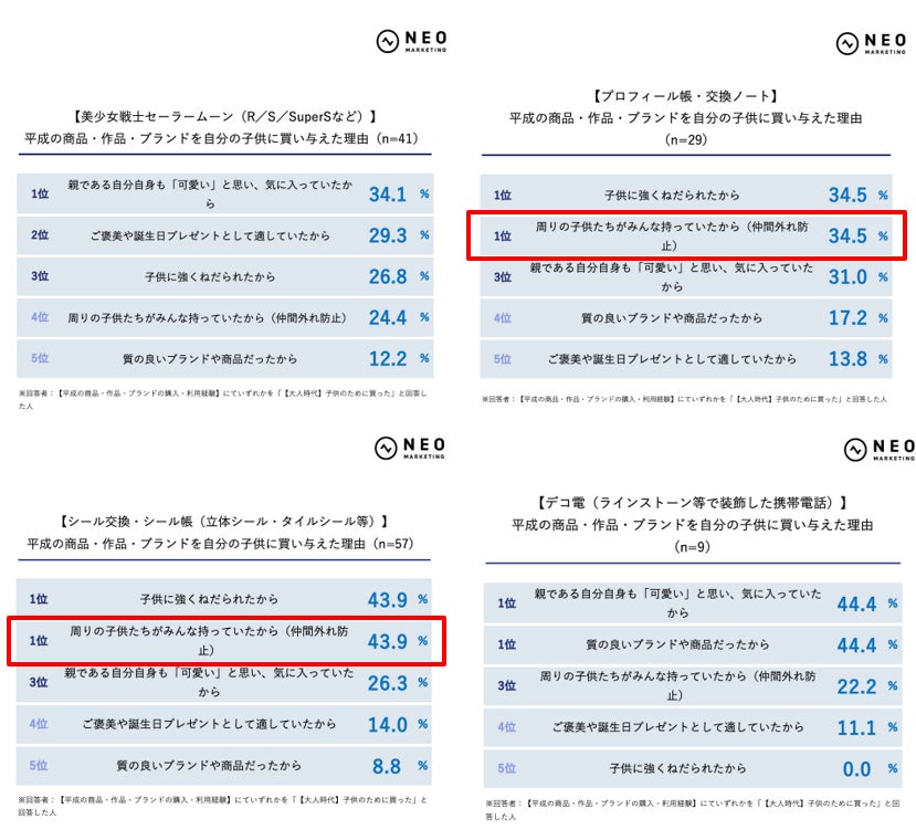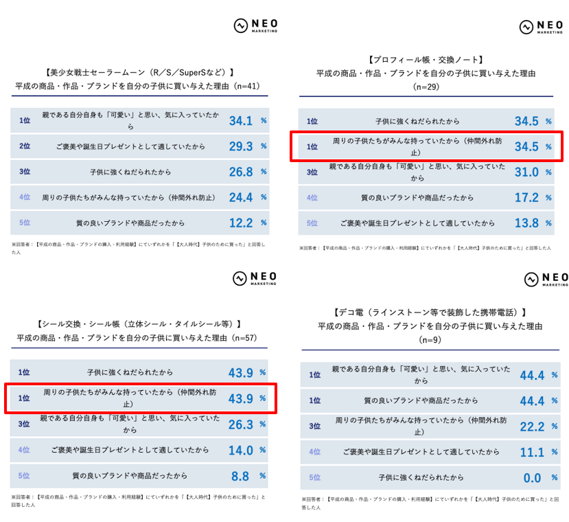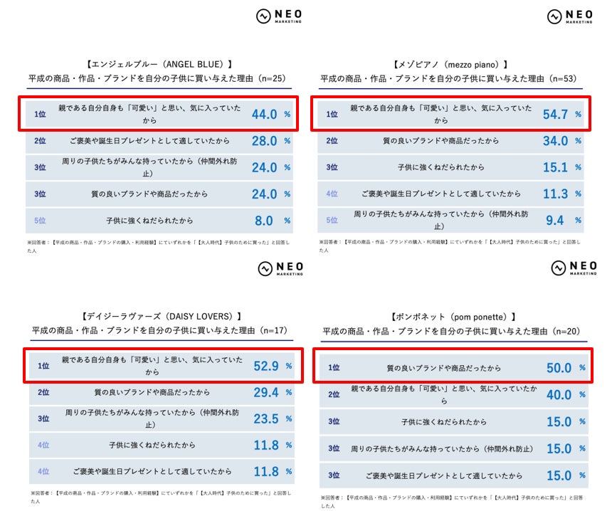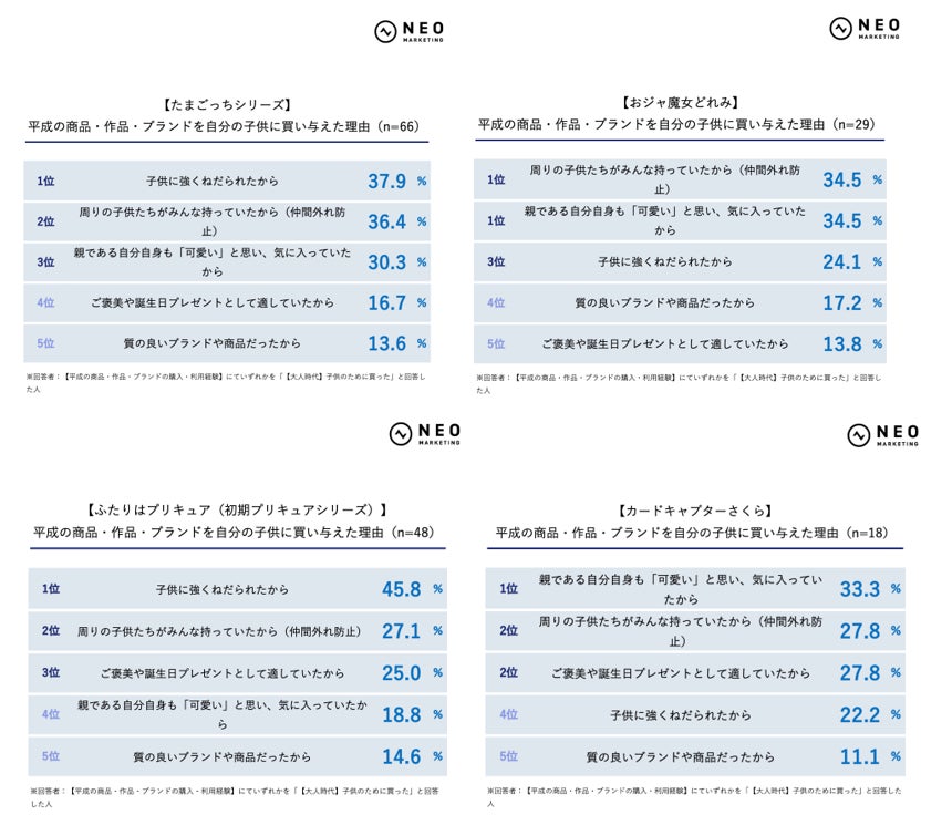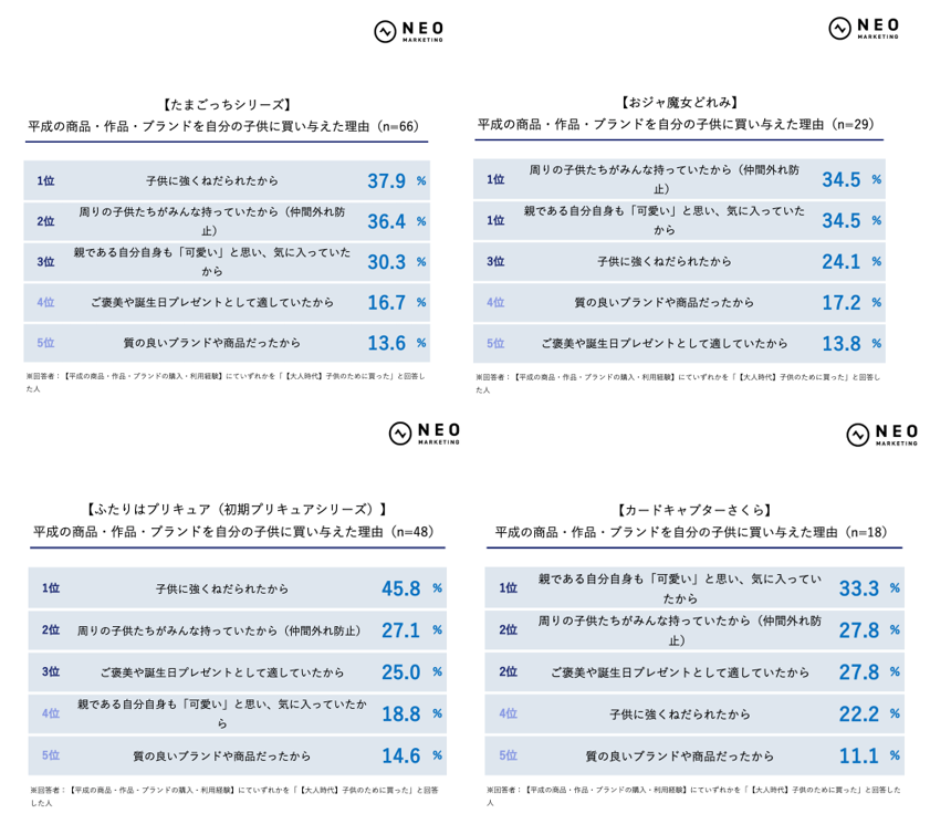 ほぼ全体を通じて「親である自分自身も『可愛い』と思い、気に入っていたから」がTOP3に入っており、購入動機のベースには、親自身の平成コンテンツに対する前向きな感情があることがわかります。