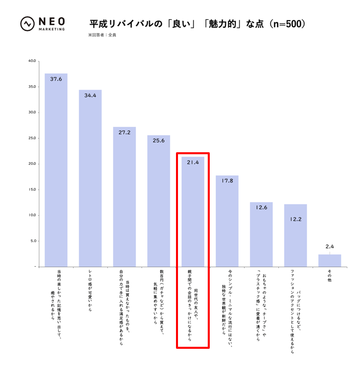 つまり、平成リバイバル消費は、親世代の懐かしさや好意が起点になりつつも、アイテムによっては子供世代の友人関係や流行の輪の中で独自に広がっていると考えられます。