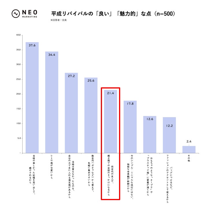 ◆平成リバイバルの「良い」「魅力的」な点は:「当時の楽しかった記憶を思い出して、癒やされるから」37.6%、「当時は買えなかったものを、自分の力で手に入れる満足感があるから」27.2%。