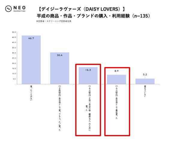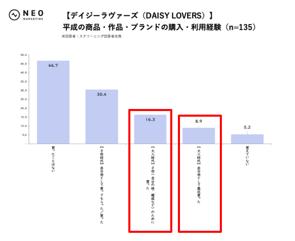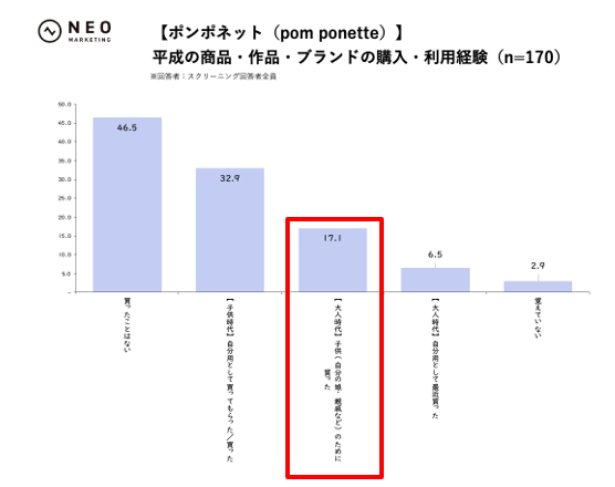 一方でファッションブランド群は、子供時代の購入・利用経験率こそポンポネット32.9%、デイジーラヴァーズ30.4%、エンジェルブルー28.0%と一定水準あるものの、大人時代に自分用として最近買った割合が比較的高めなのが特徴です。