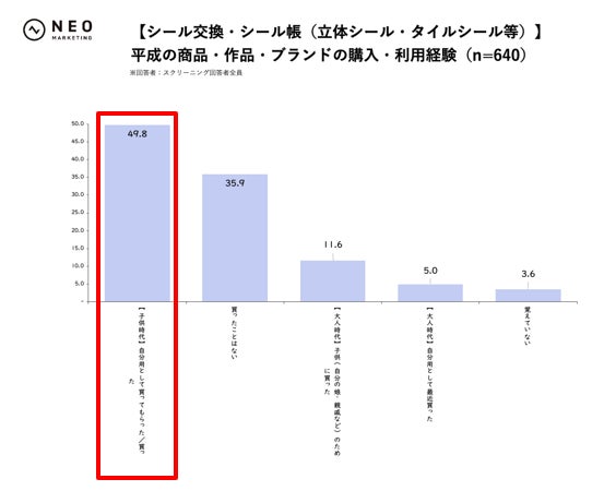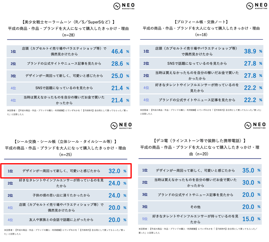 また、昨今話題の「シール交換・シール帳(立体シール・タイルシール等)」でも、「デザインが一周回って新しく、可愛いと感じたから」が1位となっていました。これは、単に平成当時の流行がそのまま戻ってきているというより、令和の感覚でも受け入れやすいデザインや見せ方に刷新されていることが、再購入の後押しになっている可能性があります。