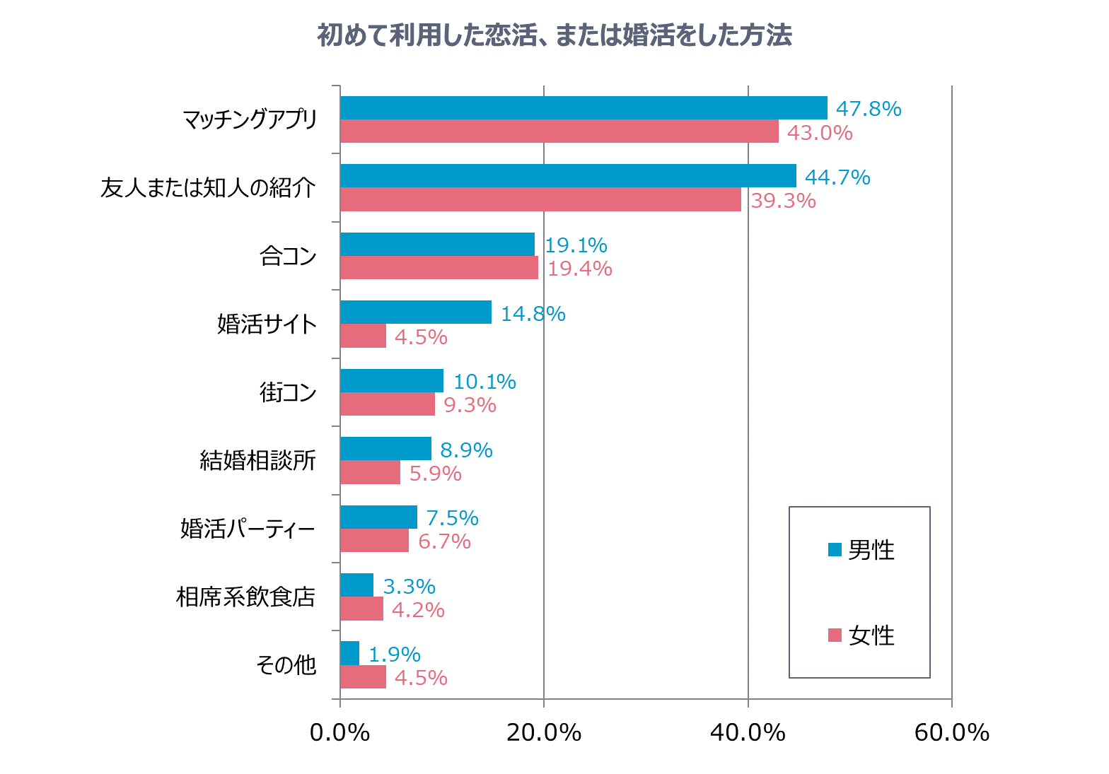 「マッチングアプリ」が男女ともに最も多く、男性47.8%、女性43.0%でした。続いて「友人または知人の紹介」が多く、男性44.7%、女性39.3%でした。「合コン」が、男性19.1%、女性19.4%でそれに続きます。