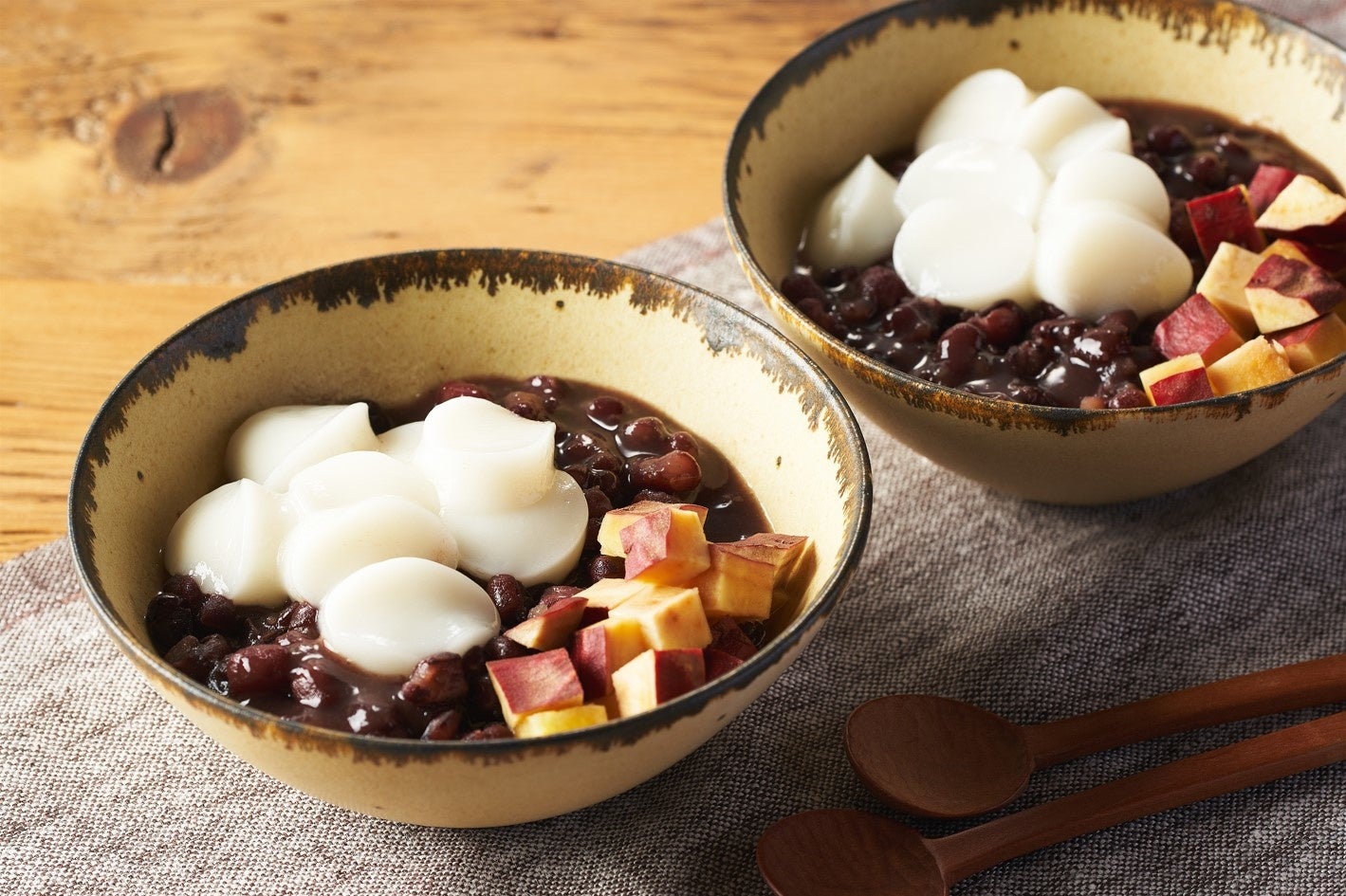 白玉は棒のような形で届けられるので、切ってレンジであたためる簡単な工程で完成します。合わせるのは、北海道産の小豆と国産原料を使用したてん菜糖で作るぜんざいと、ほくほくとしたさつまいも。甘さ控えめで体がほっこり温まるスイーツです。