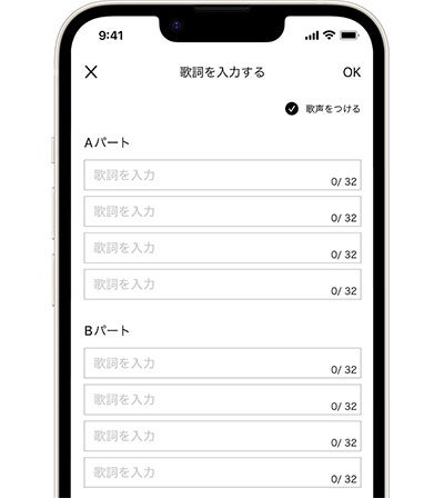 またアレンジの一環として、BGMに歌を付加することもできます。画面上で歌詞を入力すると、歌詞に合わせてボーカロイドの歌声による歌唱が生成されます。
