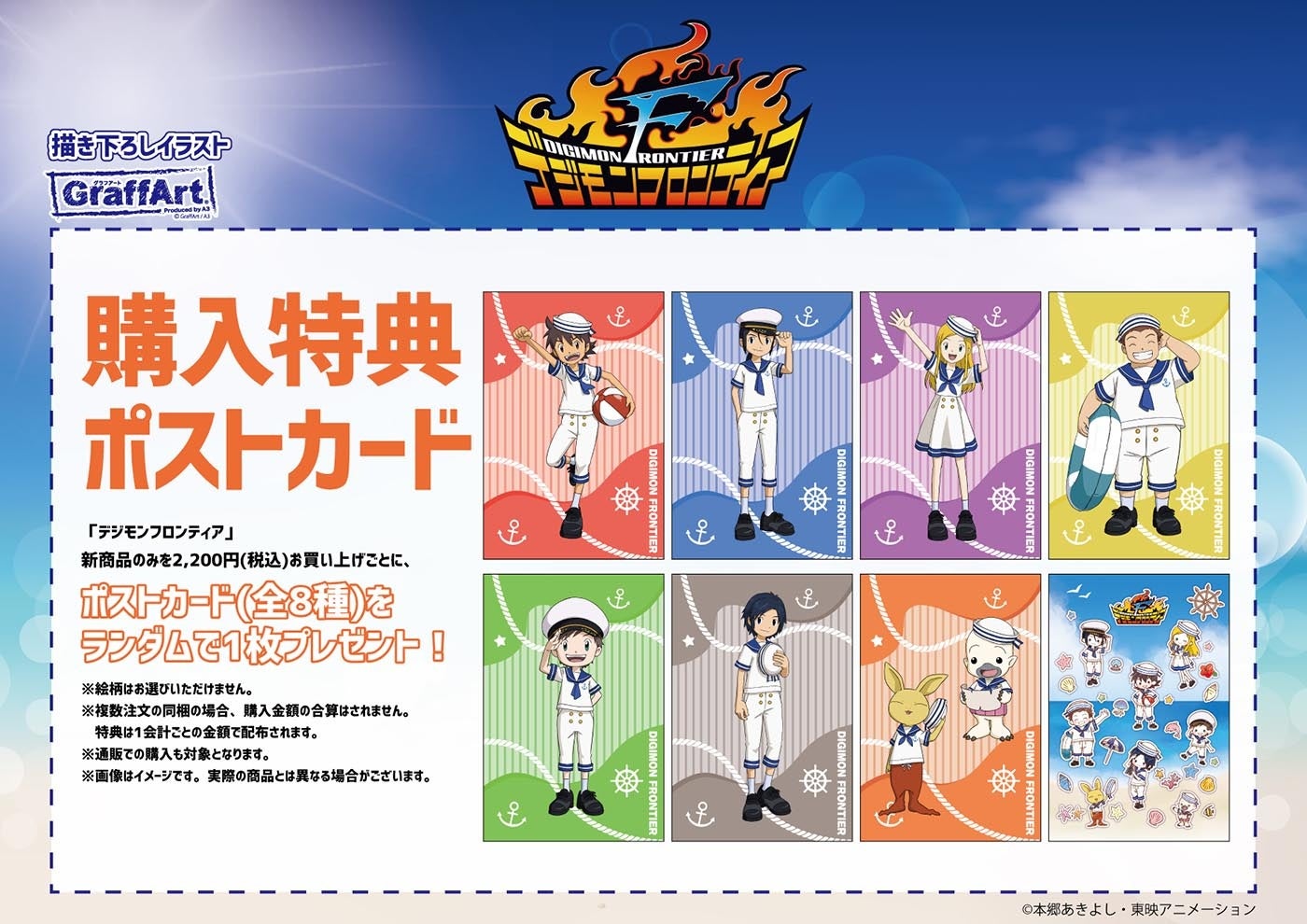 TVアニメ『デジモンフロンティア』の新作グッズを1会計で2,200円(税込)お買い上げごとに、購入特典としてポストカード(全8種)をランダムで1枚プレゼントします。