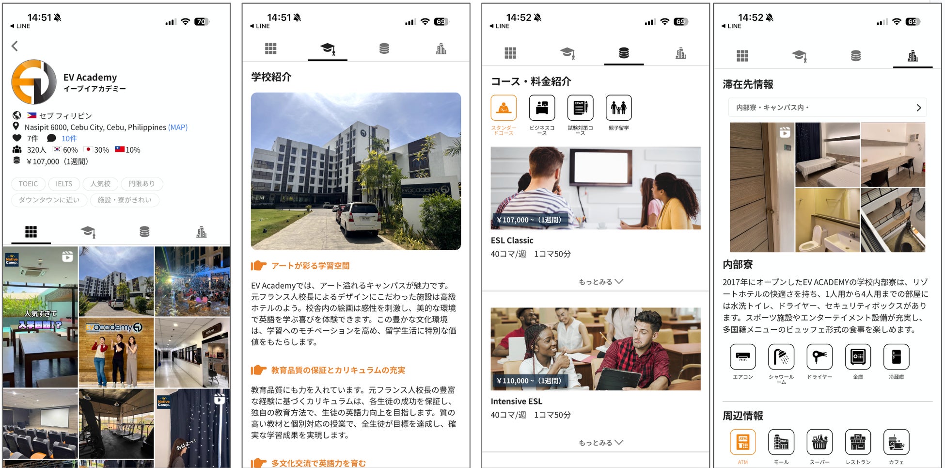 ネイティブキャンプ留学では、ユーザーが情報を分かりやすく把握できるよう、常に丁寧な情報提供を心がけています。EV ACADEMYの詳細情報は、以下の4つのカテゴリーに分けて掲載しており、知りたい情報を的確にお届けします。