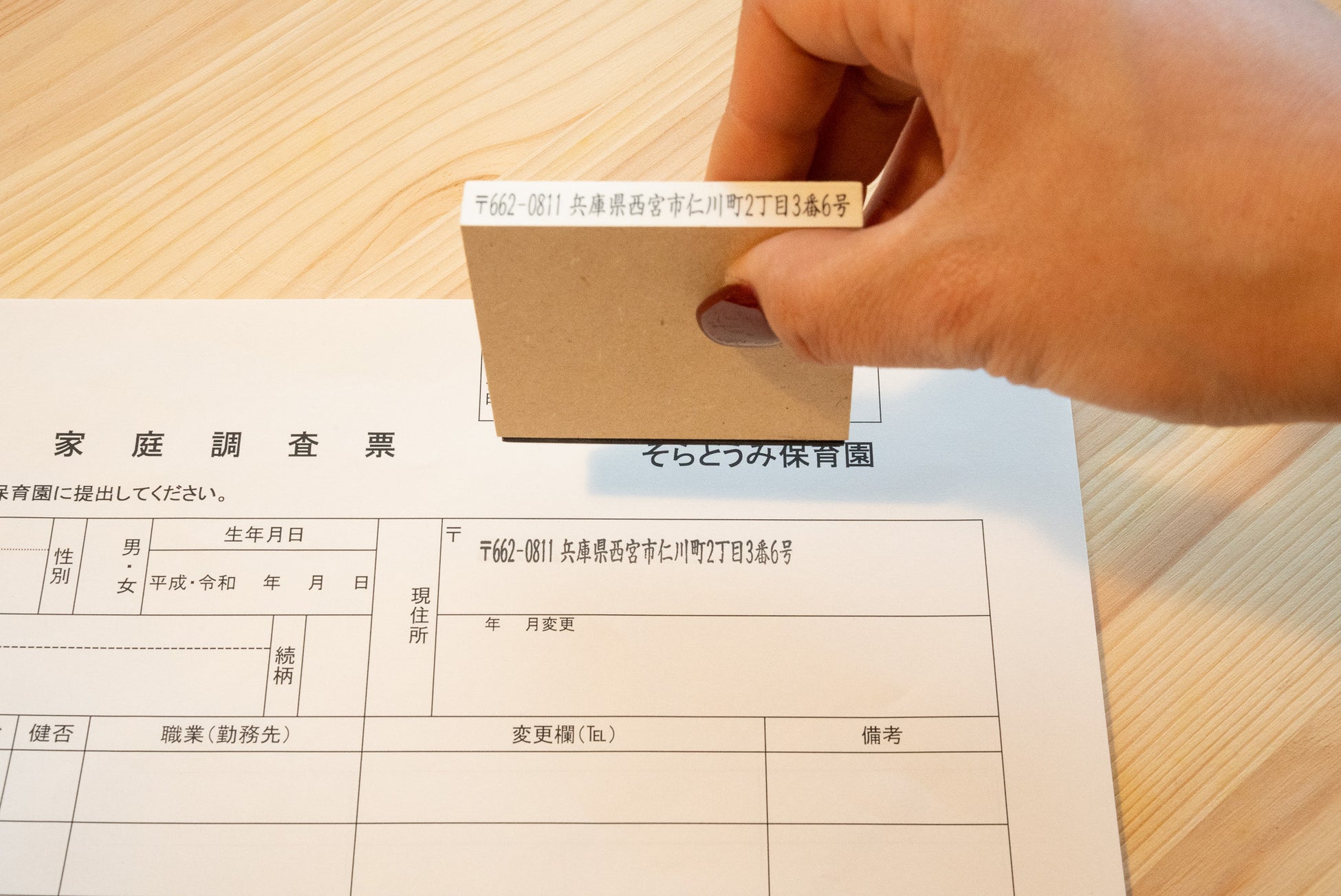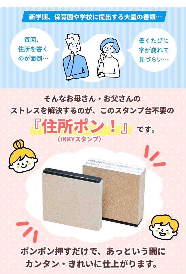 手書きのストレスから解放されて、お子さまの書類準備をラクにする住所スタンプ「住所ポン!」。住所を書く手間をなくし、大切な時間をもっと有意義に使いませんか。