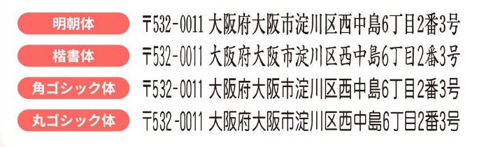 「住所ポン!」の書体は、明朝体・楷書体・角ゴシック体・丸ゴシック体の4種類から選べます。