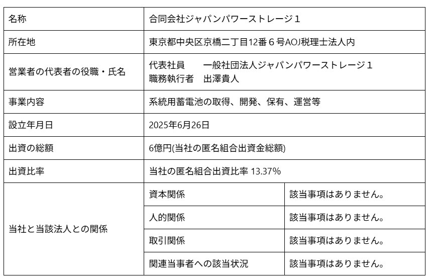 系統用蓄電所に係る匿名組合出資に関するお知らせ
