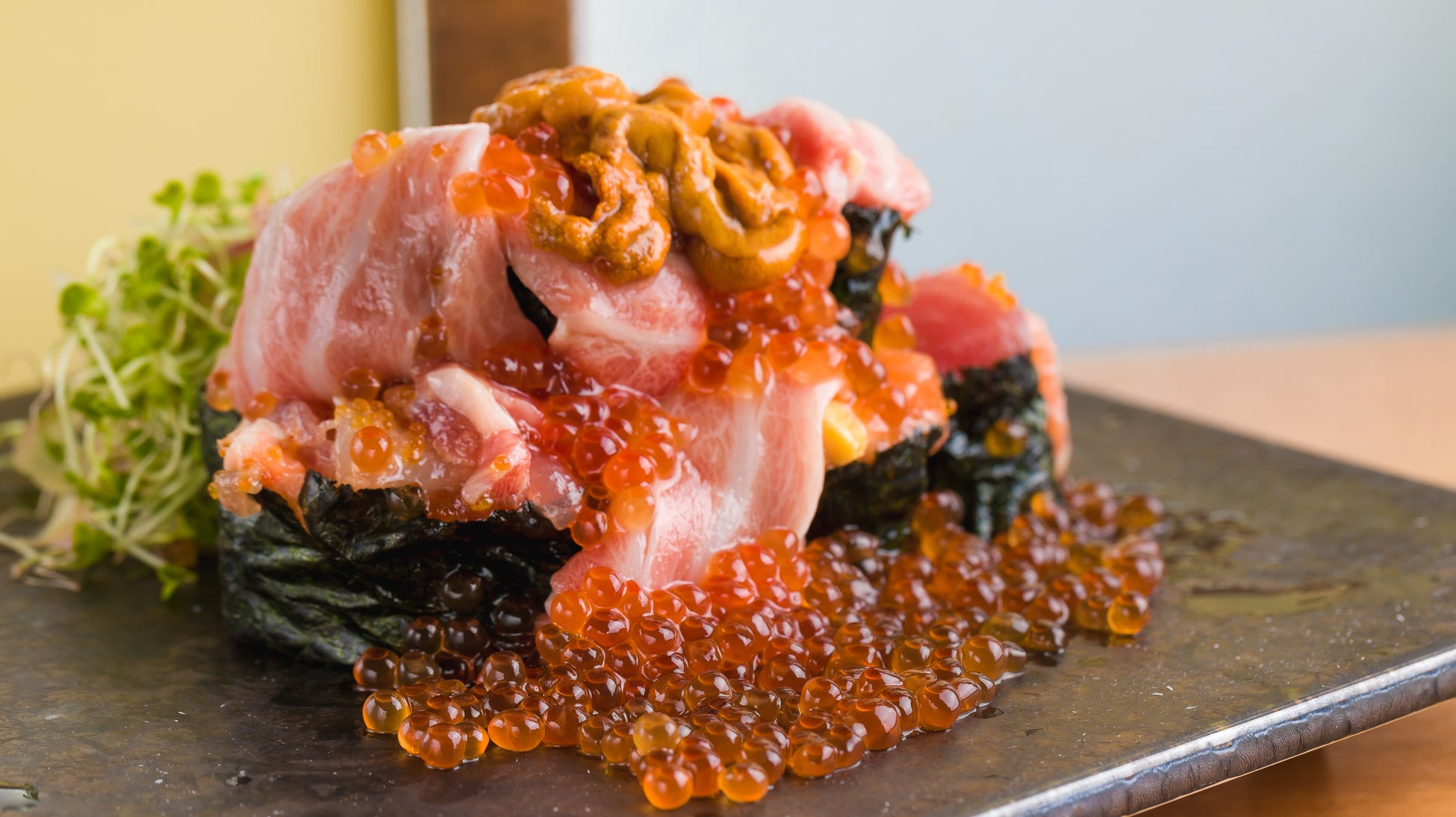 新登場の“フジヤマこぼれ寿司”は本マグロの大トロを豪快に乗せた軍艦の上から、ウニ・イクラをこれでもかというほど乗せた、類を見ない贅沢すぎる仕上がり。コース料理でのみお楽しみいただける特別なお寿司ですので、ぜひフジヤマの厳選コースをお楽しみください。