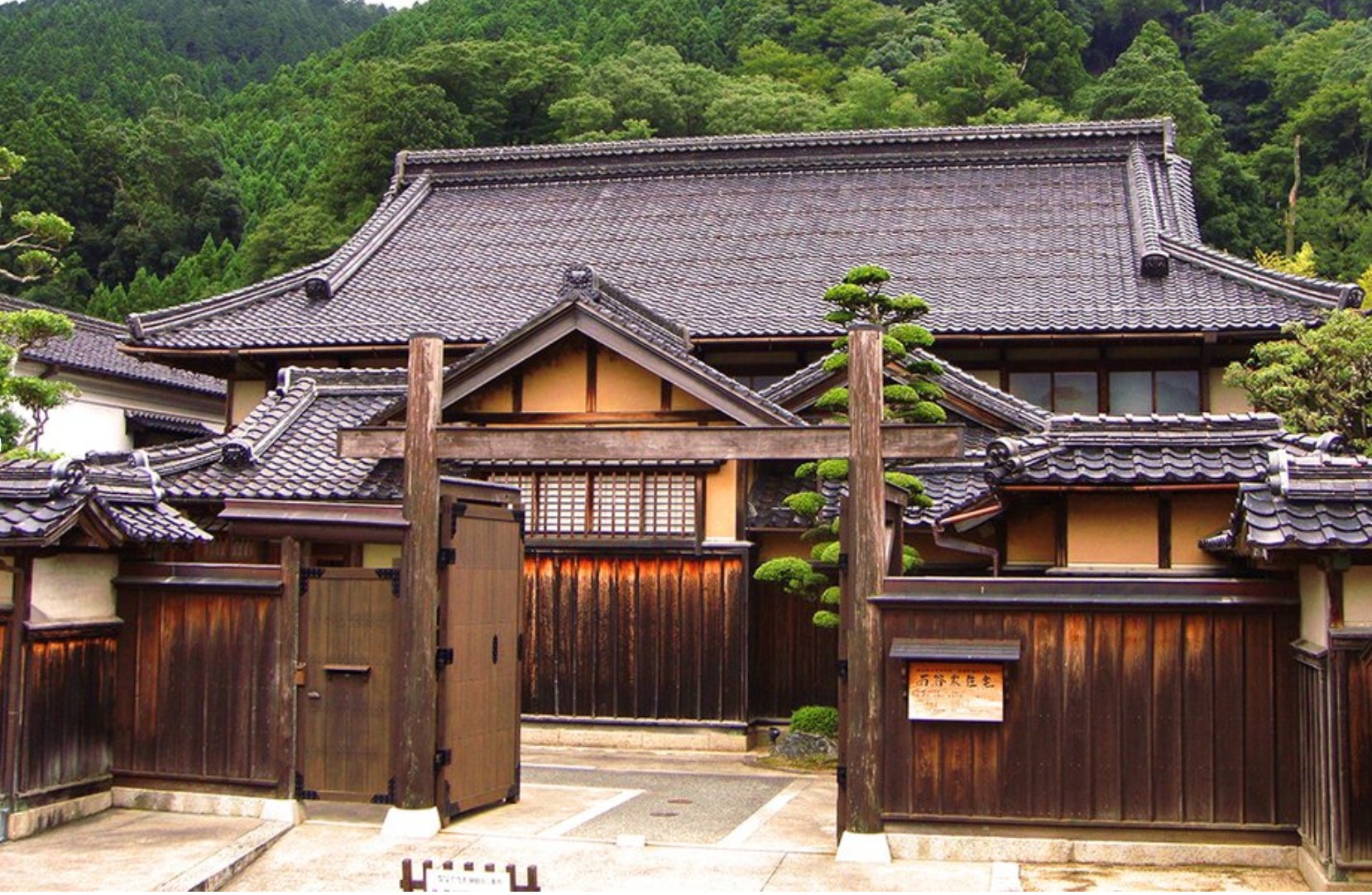 林業で財を成した石谷家が、全国から銘木と職人を集め、10年かけて建てられた他では類を見ない豪華な屋敷。3,000坪という広大な敷地の中に部屋数が40以上ある邸宅、7棟の蔵、重厚な大門、そして美しい日本庭園を有し、江戸~昭和という長い歴史の重なりを表現した貴重な和風建築として国の重要文化財に指定されています。入り口をくぐると高さ14mの吹き抜けの土間が広がり、巨大な梁組みと太い柱が建物の風格を際立たせています。