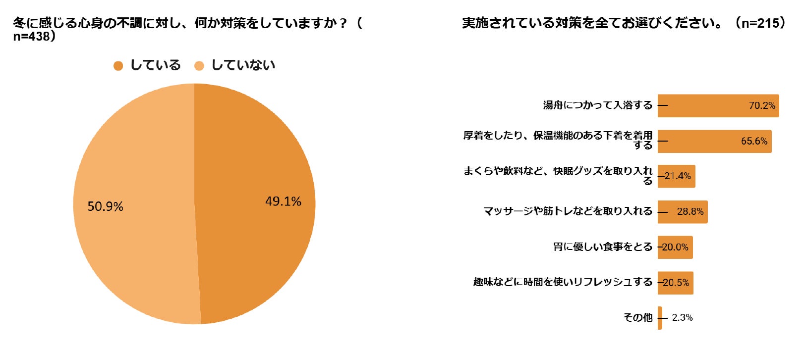 さて、実際に皆さんはどのような対策をしているのでしょうか。冬に感じる心身の不調に対し、「何か対策をしている」と回答した人は49.1%と半数近くいました。そのうち普段から実施している対策として一番多く上がったのが、「湯舟につかって入浴する」(70.2%)こと。